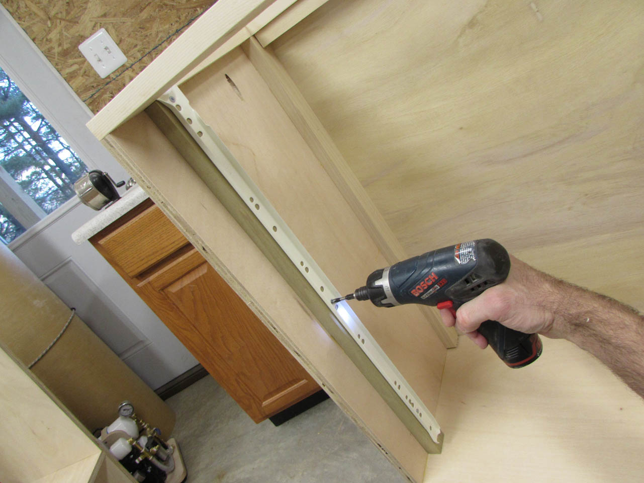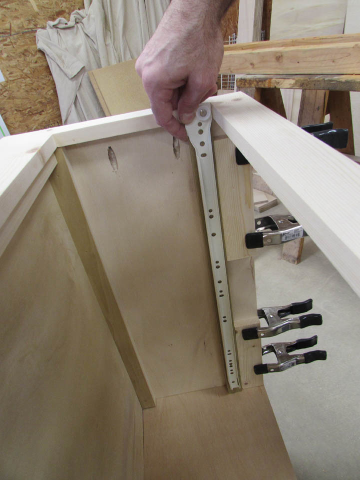 I held the slide about 1/8″ down from the face so that the drawer would set slightly recessed and attached the slides along the new strip.