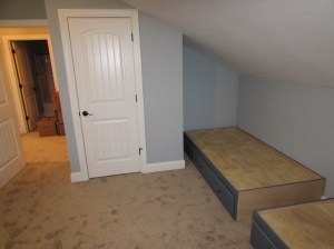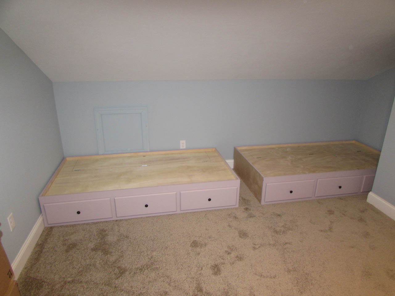 The two drawer bed tucked in next to the closet and the three-drawer one sits in the other corner, with a small gap in between.