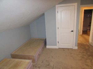 The gap in between is where the new shelf will go to divide the beds to give storage and a bit of privacy to each child.