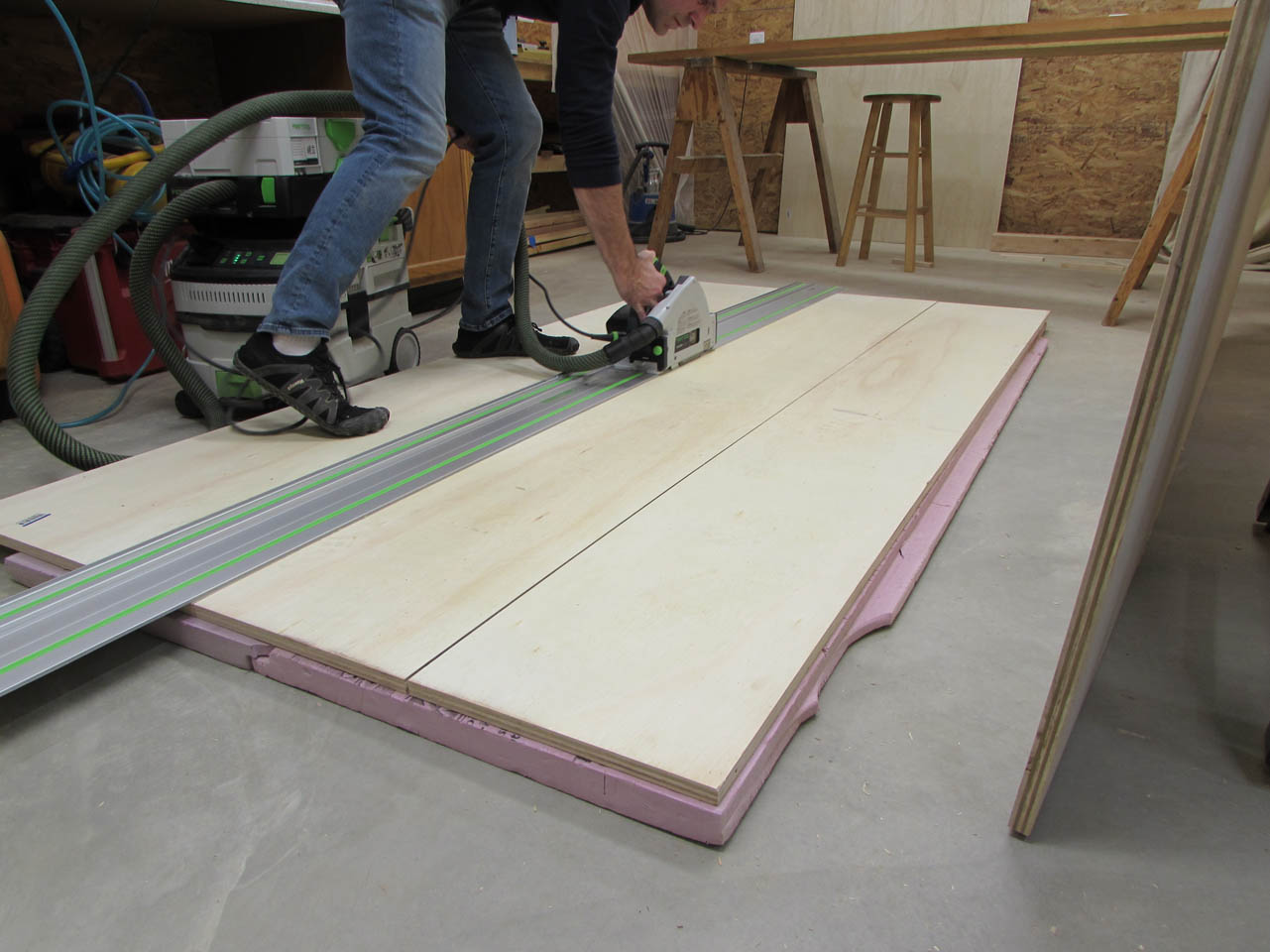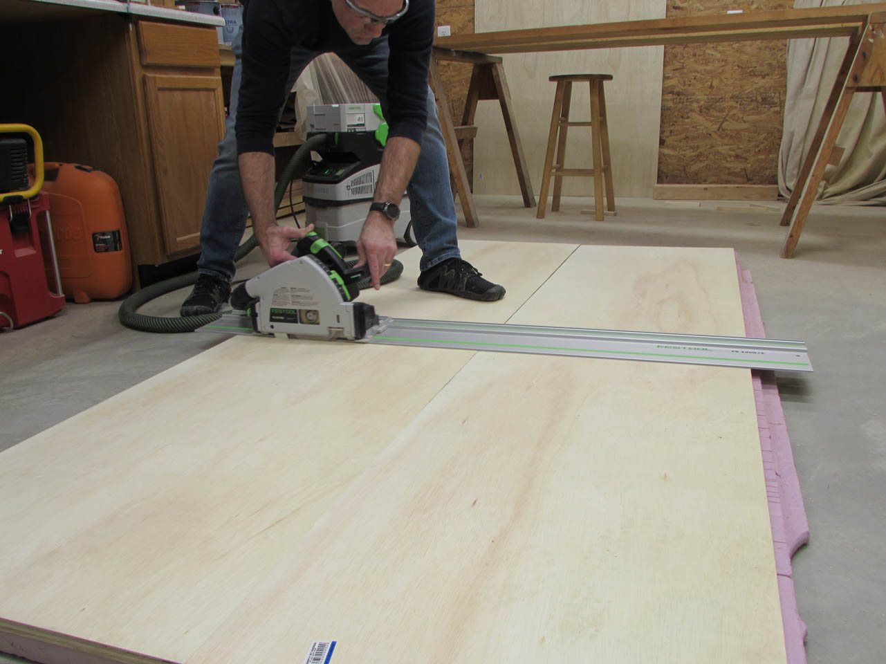 I let them sit overnight to dry out a bit more and moved on to breaking down the plywood. I used my track saw to cut it into slightly over-sized pieces that I can refine on the table saw.