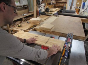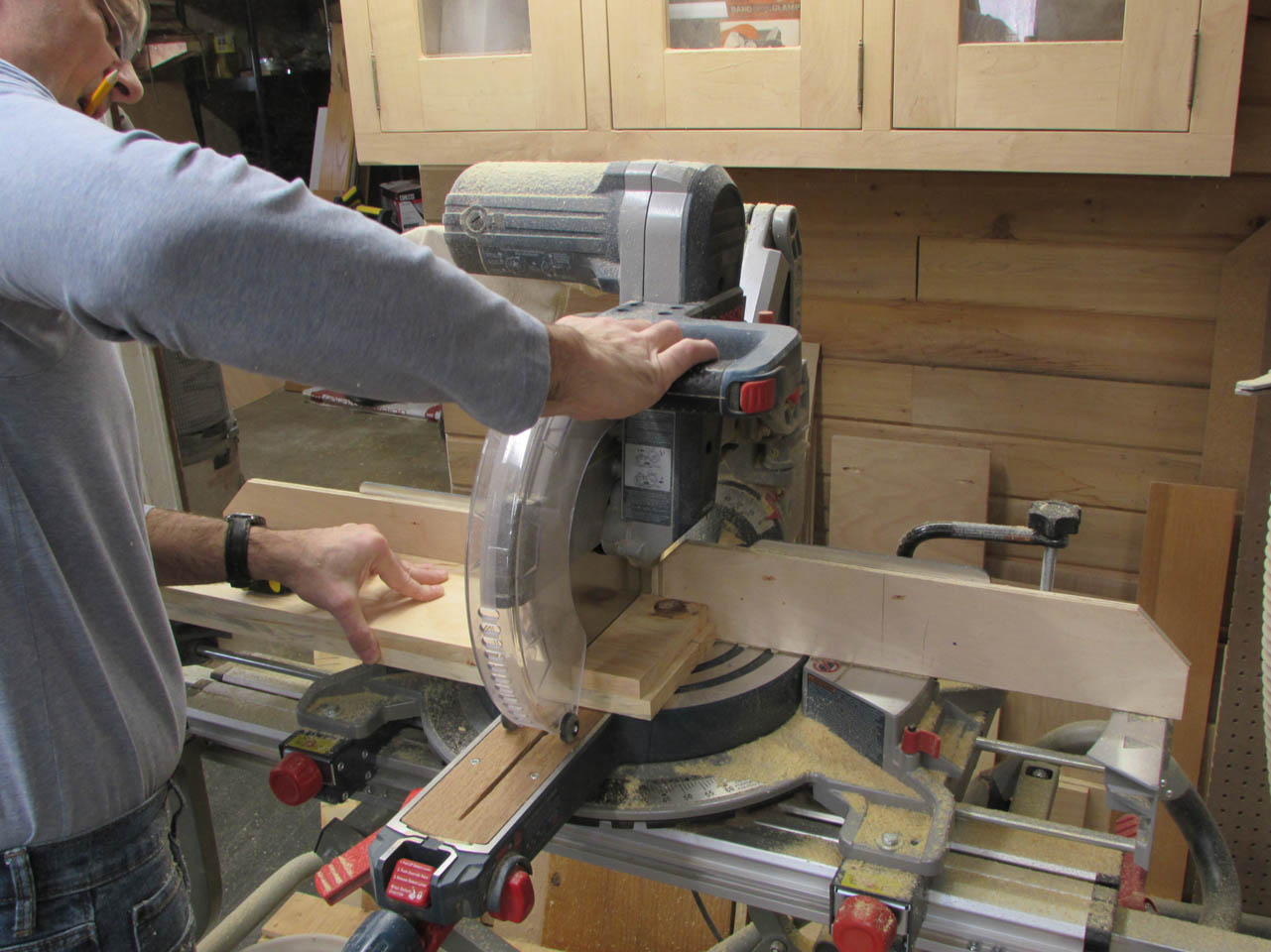 With the pine parts processed, I started shaping the plywood parts. I put an angle on the top of the shelf sides with the chop saw.