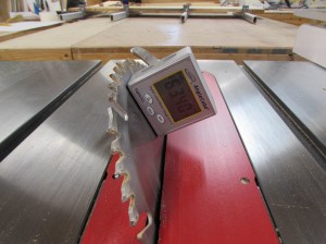 But the small angle at the top of the plywood pieces was cut on the table saw, using a cross-cut sled. I used a digital gauge to set the exact angle of the table saw blade.