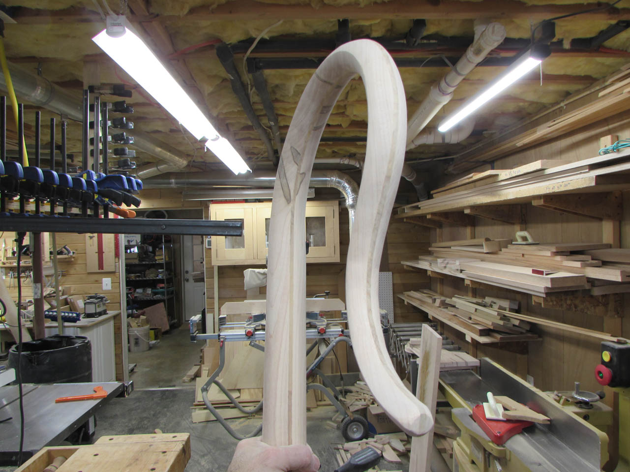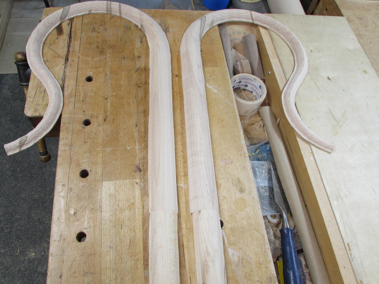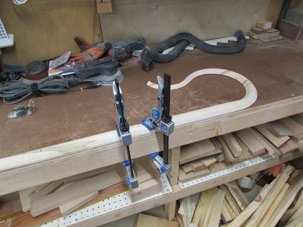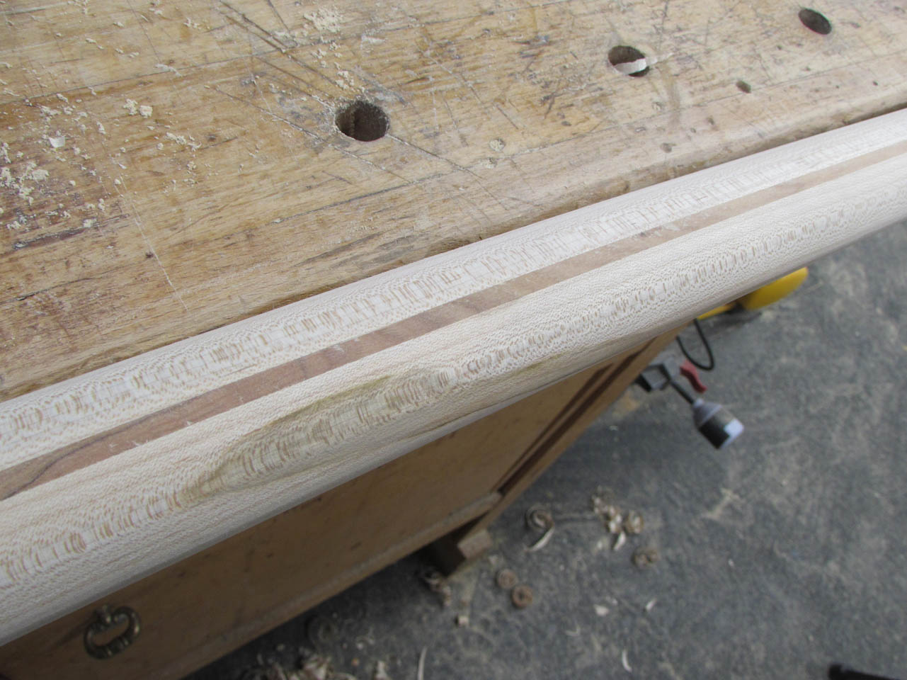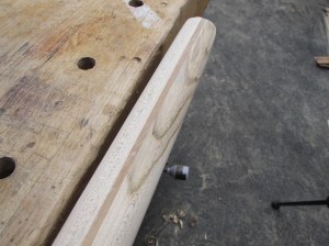 The curves and the multiple grain orientations also make it a pain to shape and smooth… Most of the curve will have to be final shaped by hand with a couple of rasps.
