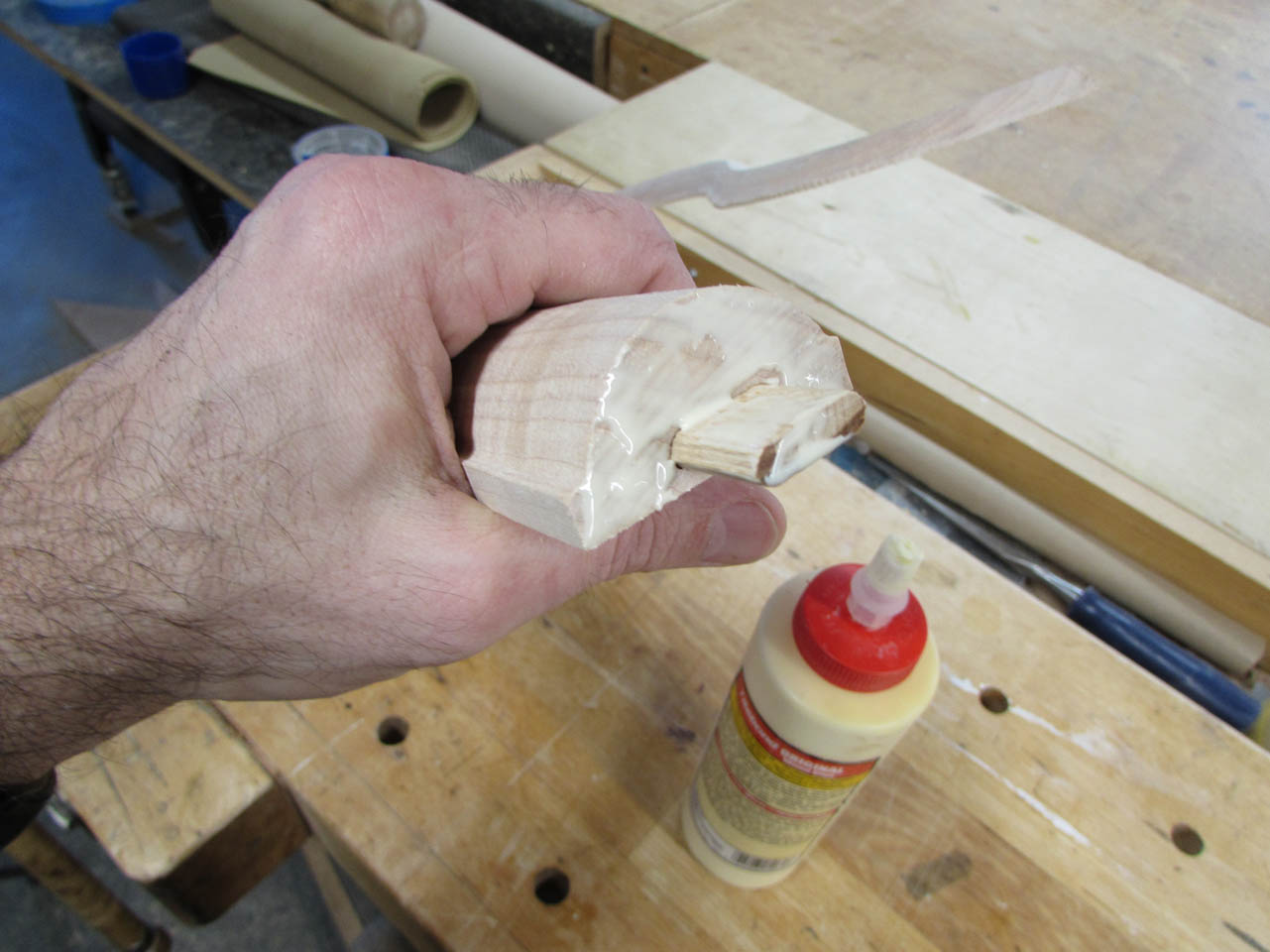 I evenly spread wood glue in a thin layer along the first half of the crosier.