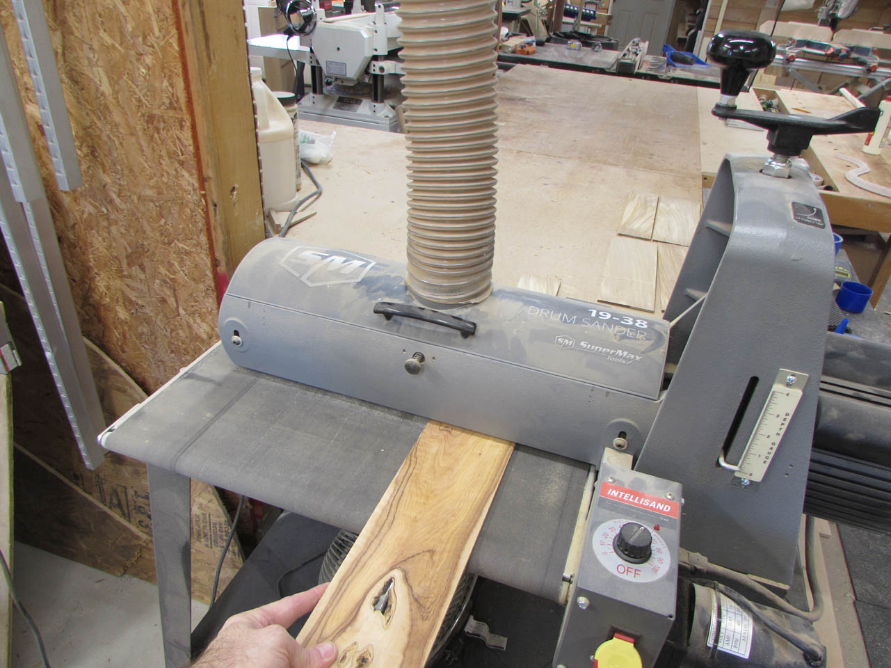 The dry stuff I have will be sufficient so I took it over to the drum sander to smooth out the side that I just cut on the table saw.