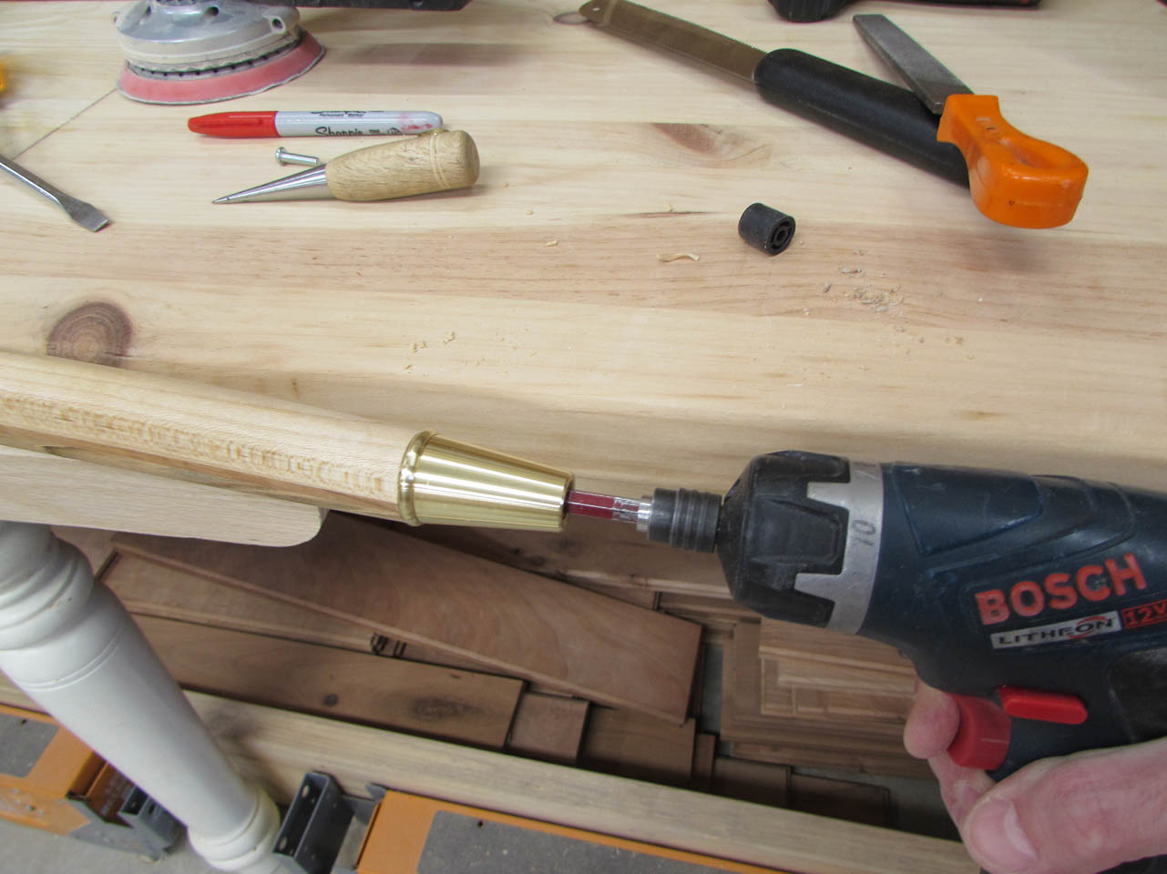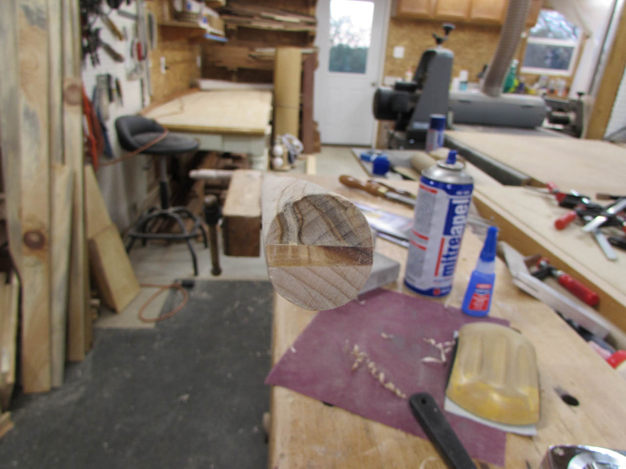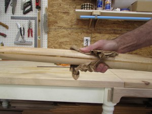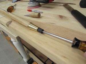 I want a nice brass tip for the bottom of the staff. The only place I found one large enough was Lee Valley out of Canada. I ordered it but it will take a few days. I need to get the finished size of the tip down to a 1″ diameter so I broke out the spoke-shave and started finessing the elliptical end down to a circle.