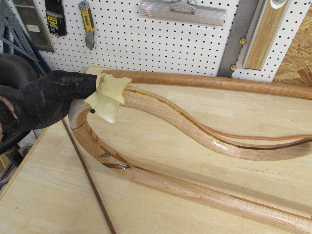 I placed a few off-cuts of the wormy maple in the center to prevent the top from being pressed down in the middle. Might be a nice souvenir for someone.