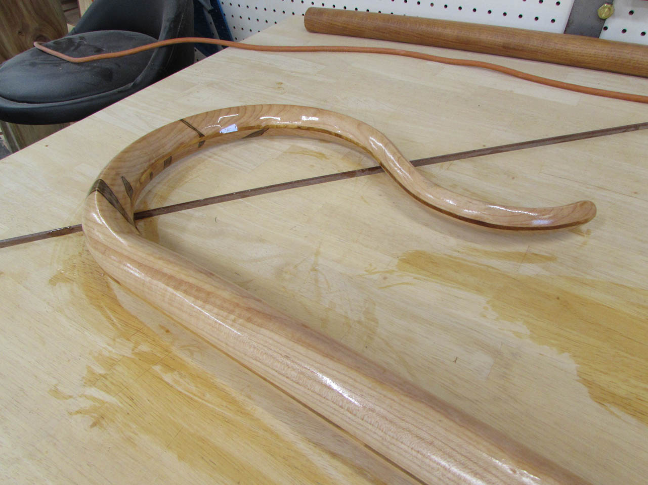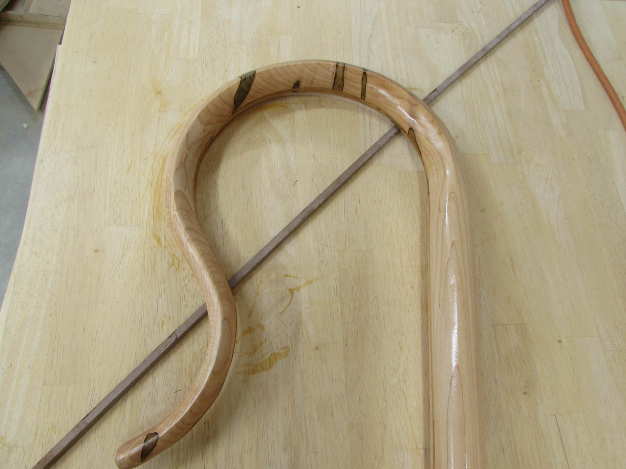 This was a challenging but fun project. I was really happy with how it turned out. The cross-lamination of wood has really strengthened the curve at the top. This is the first time I have worked with olivewood and the first single piece crosier that I have made so this one is truly one of a kind.