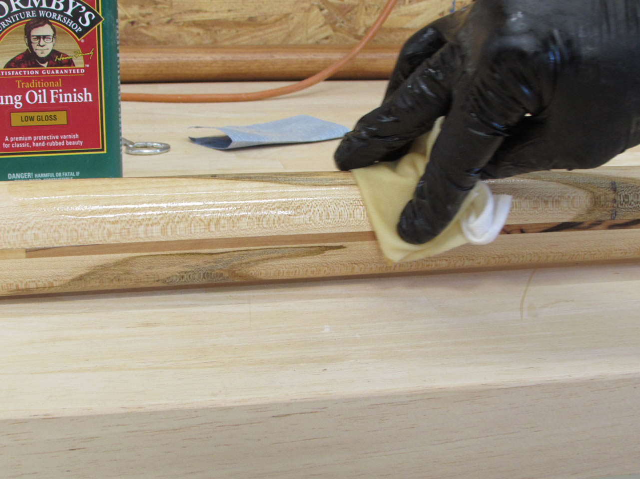 Since I have a few days to wait, I decided on a low-gloss Tung oil finish. The oils will really bring out the colors and give the wood a warmer tone. There is also a protective polymer in this oil finish that will soak into the surface and build up with successive coats.