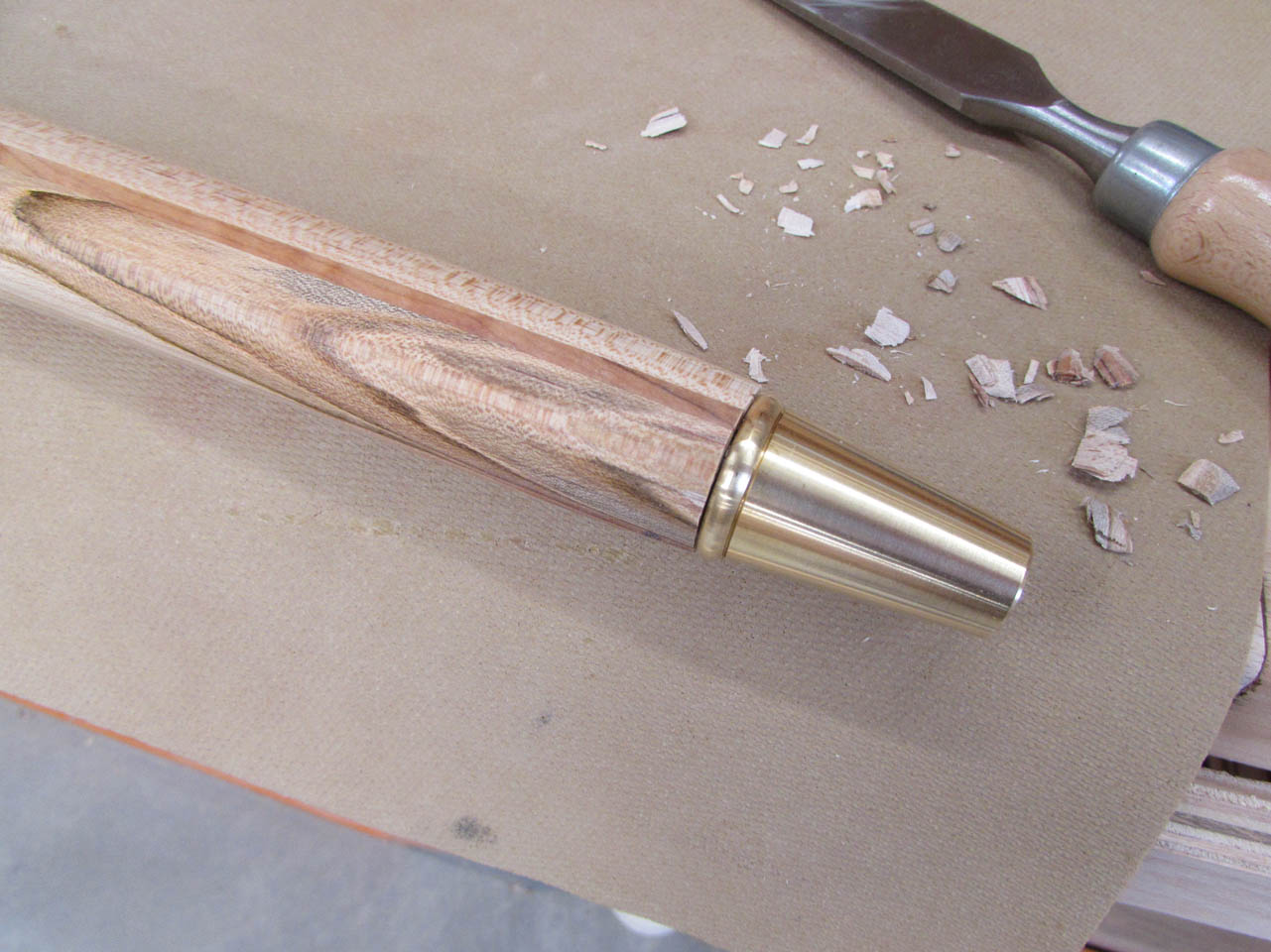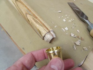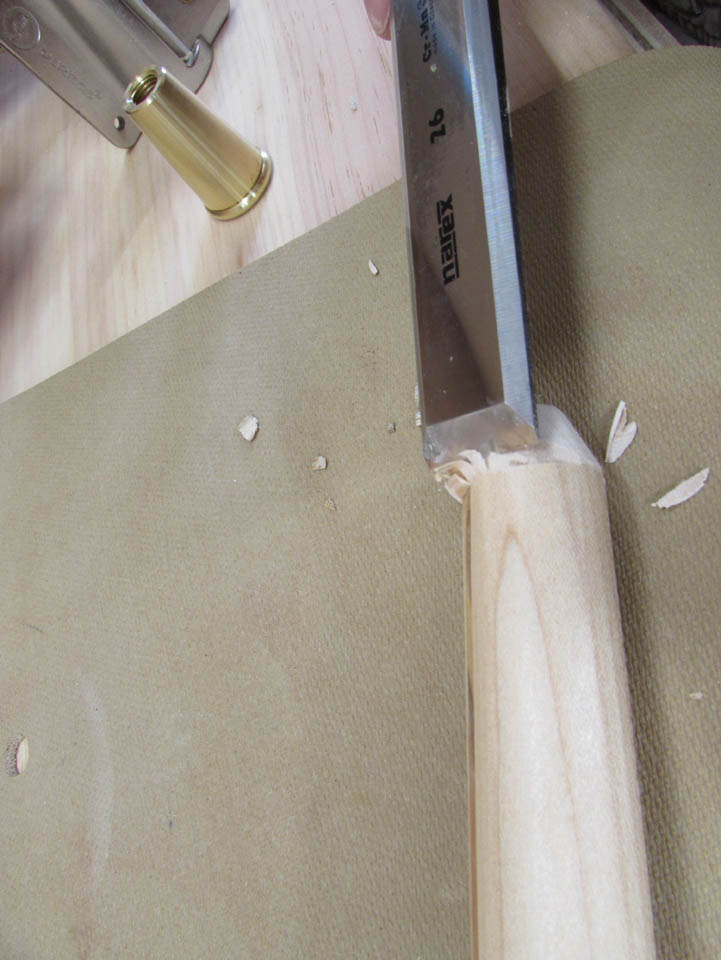 I need to taper the end a bit and step the radius down to fit inside the metal tip. I use a chisel to cut the shoulder in, all the way around, then pare back the wood to the shoulder with the same chisel.