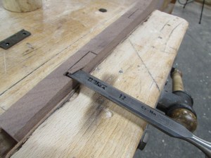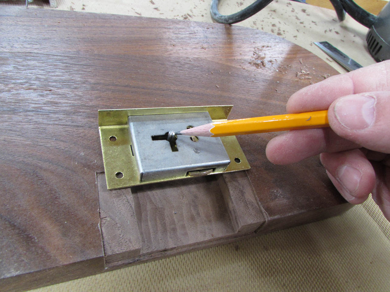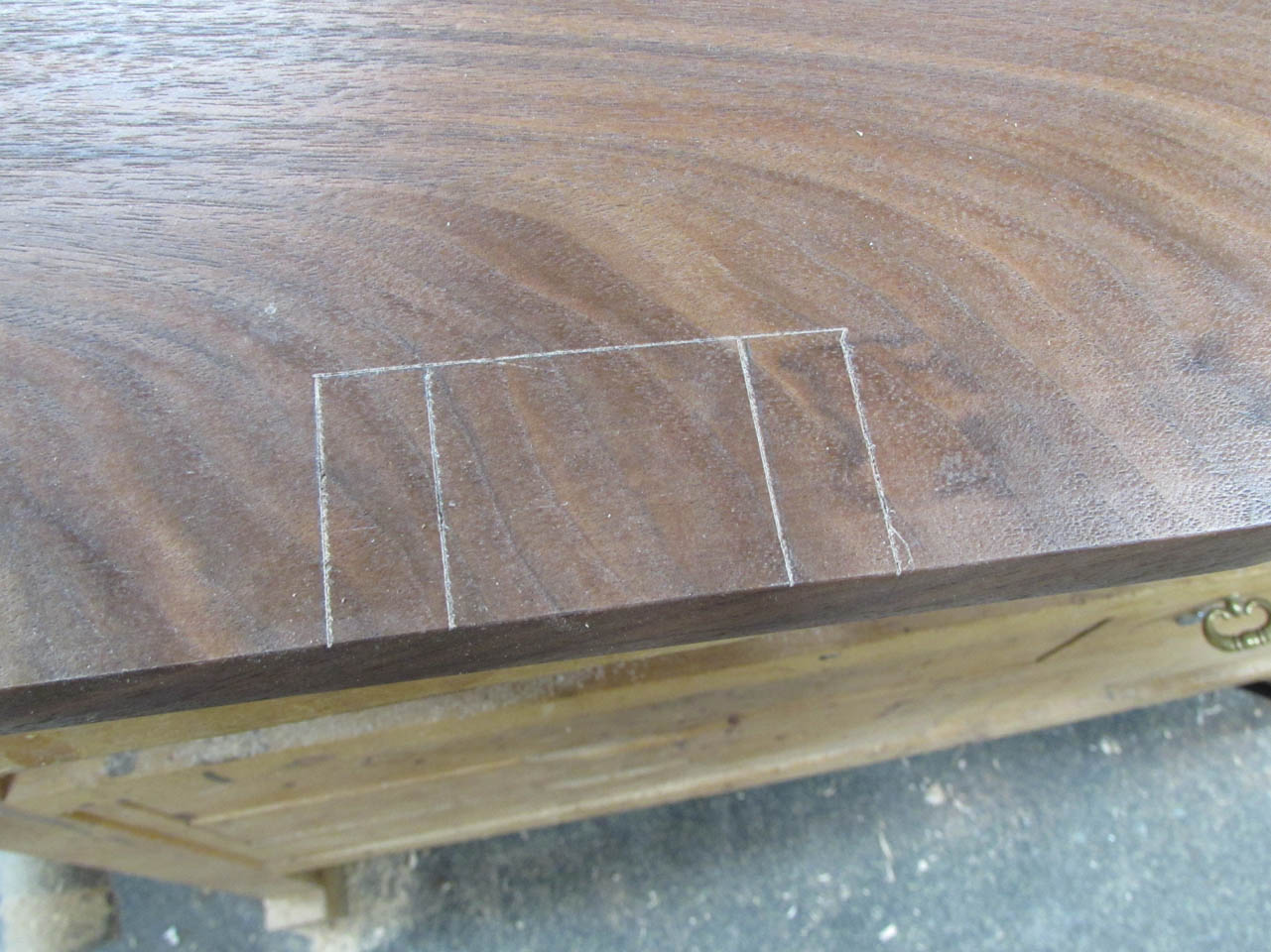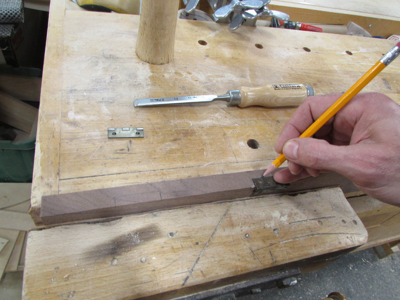 I laid out the edges of the lock that needs to be mortised in, then scored the marks with a knife so that the marks would stand out on the finish.