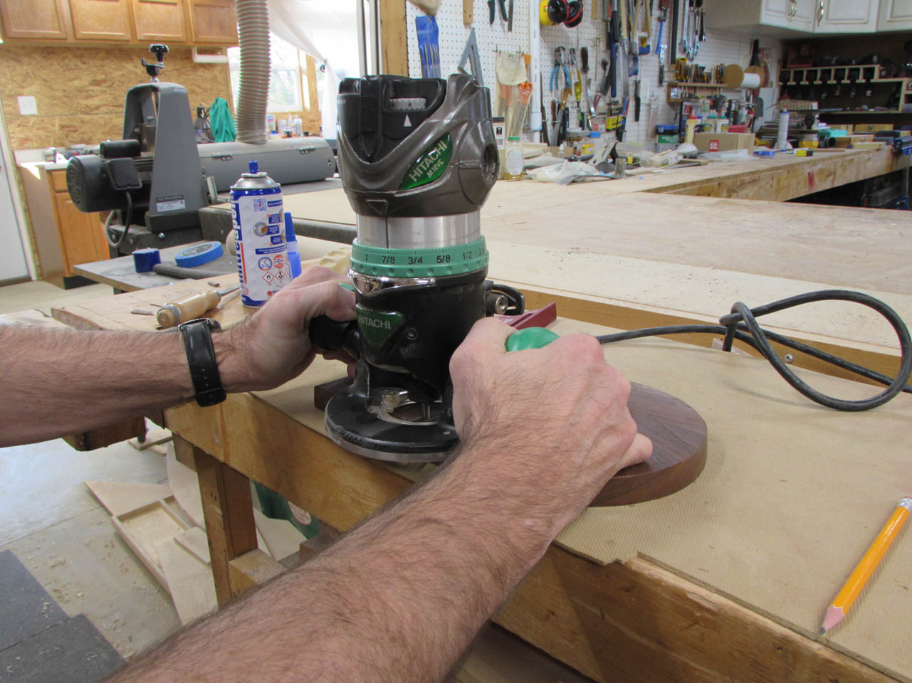 I started with the usual method of slowing down the large bit and making multiple passes but I discovered, after the first pass, that I would have to cut it all in one pass because I had no way of holding the wood perfectly vertical once the flat face was removed.
