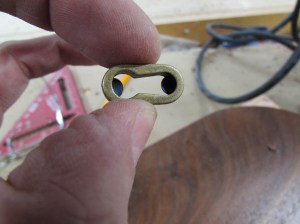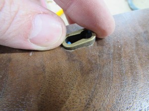 This will allow me to press-fit one of the brass escutcheons into place. Once I select the one I want and press it in, I can use a screw driver to press the thin metal discs into the wood to hold it there permanently.