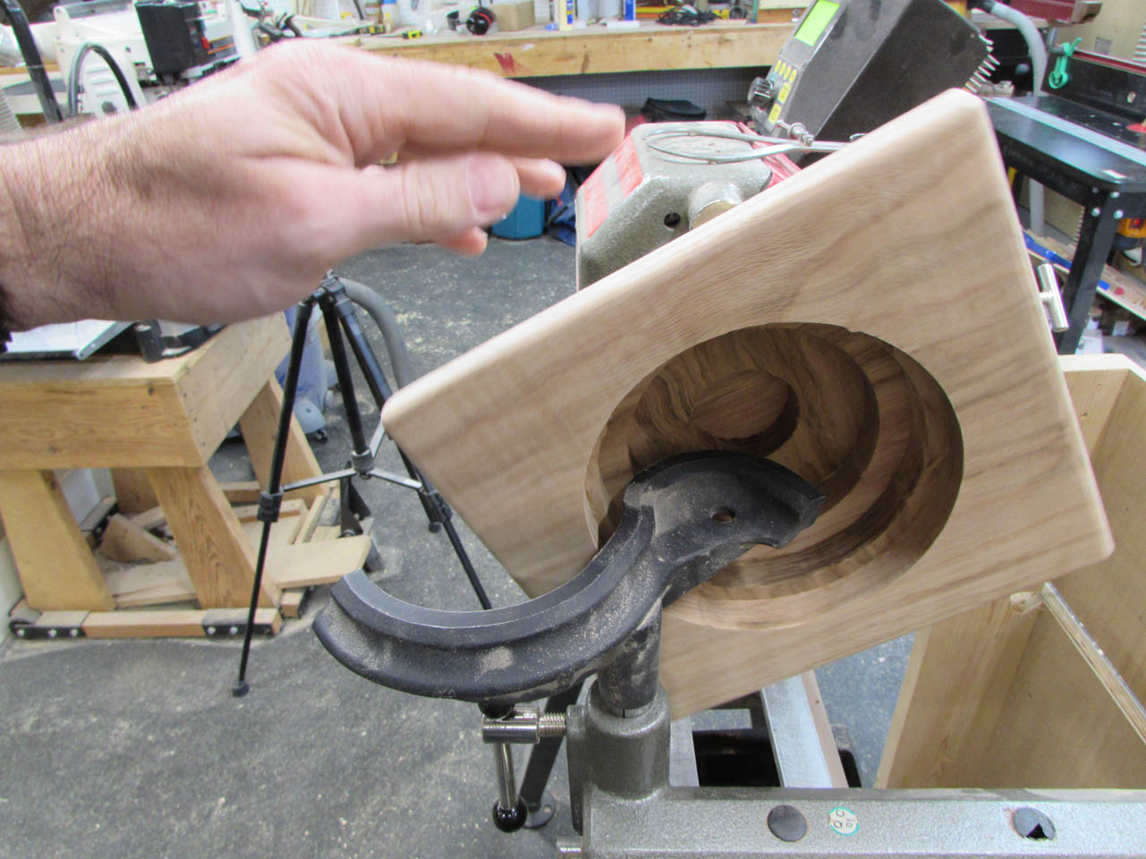 Standing well back, I slowly sped it up to about 1,800 rpms. It sounded like a helicopter but everything looked stable so I got out my round carbide scraper and started removing the steps inside the bowl. I actually designed the holes, in the centers, to be the exact dimension at the bottom of the curve.