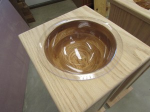 Some of the epoxy was brushed onto the top surface. I used the orbital sander to sand back the top surface so that I can stain the top evenly. The epoxy actually has an amber tint of it’s own so it will be a pretty close match to the stained wood.