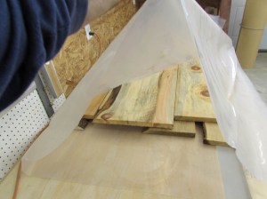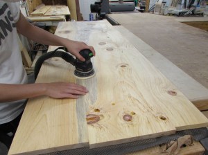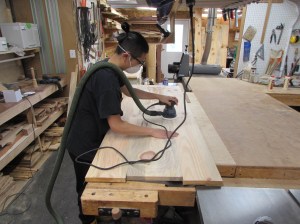 This was not an exciting day for Raphael. I normally work with hardwood and rarely with pine. When I sand hardwoods, I primarily use 120 grit paper or finer. The 120 grit paper gums up very quickly with the air-dried pine. The resins in the wood combine with the dust to clog up the sand paper almost immediately. I think we went through seven or eight sheets of paper just on the top surface of one desktop.