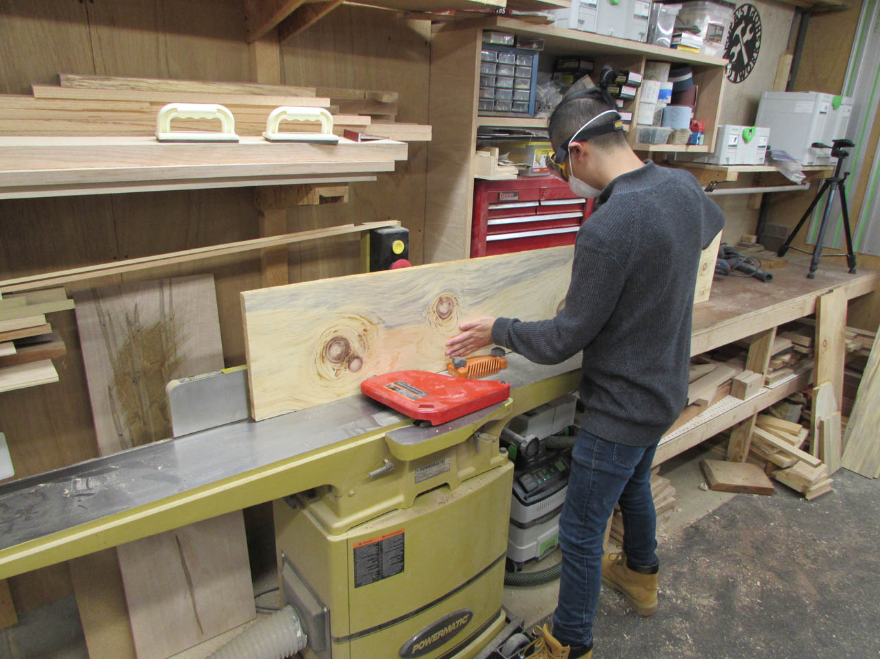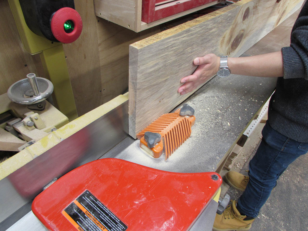After planing the faces, Raphael ran one edge through the jointer to straighten one side and make it 90° perpendicular to the face. This is crucial to be able to join the edges together and create a flat desktop.