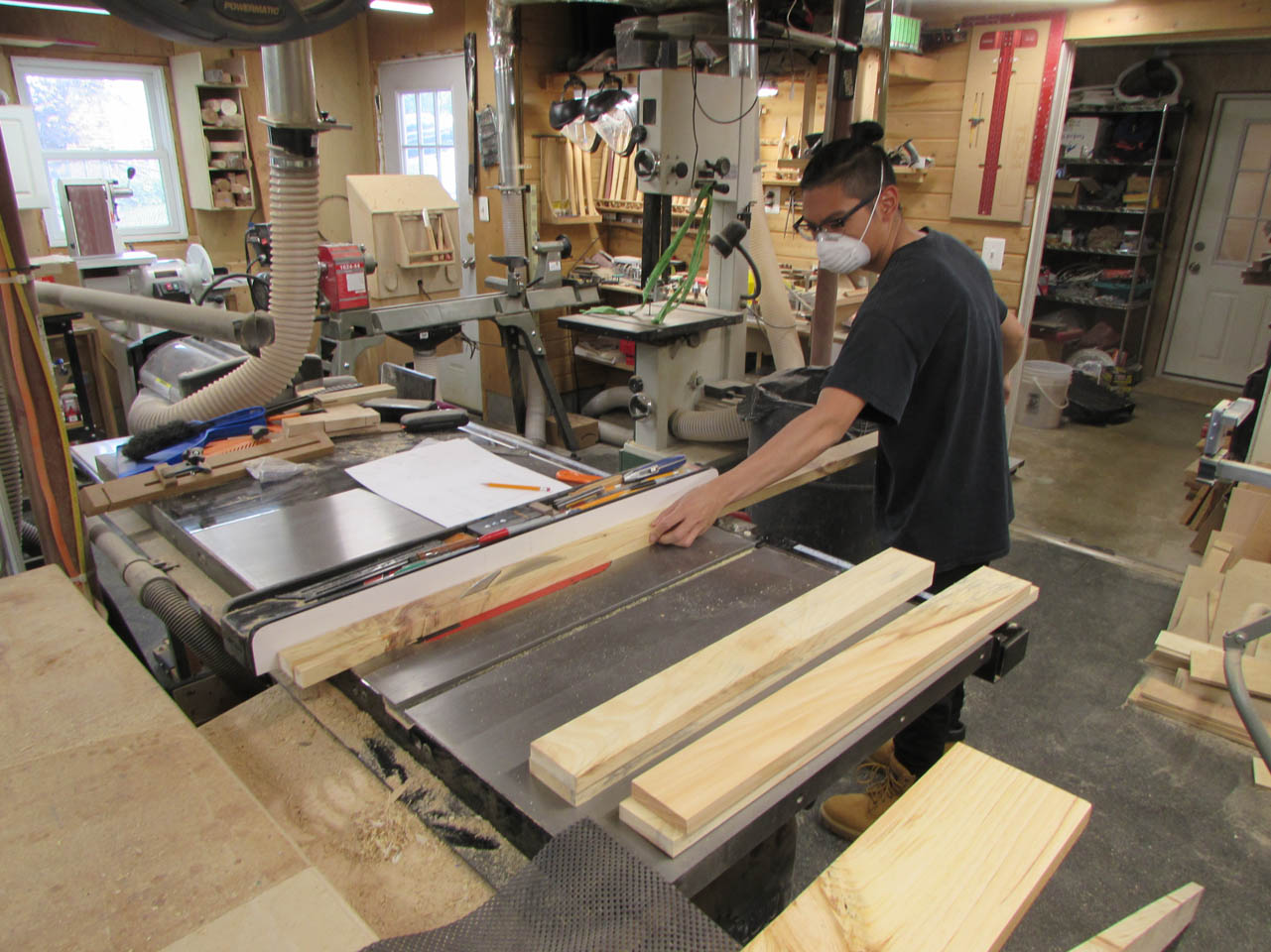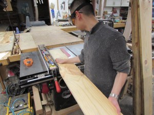 Once the first edge is jointed straight, the opposite edge is cut parallel on the table saw. Another left-handed student in the shop. I will never get used to how awkward it looks to work left-handed on the table saw. I moved the fence to the left side of the blade to make it a little easier for Raphael to work.