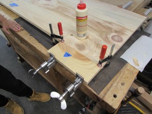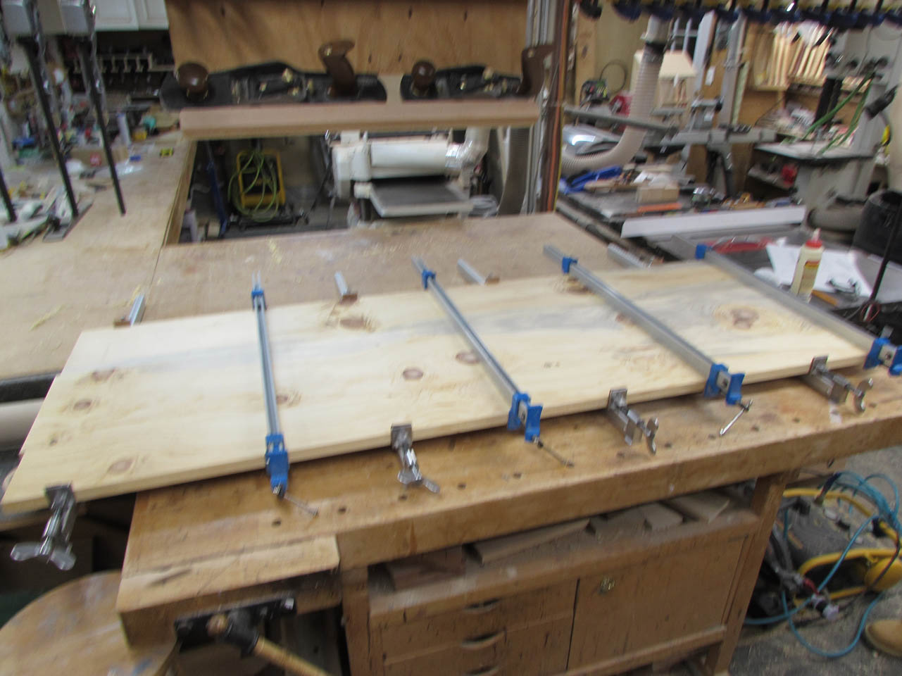 Any dry spots will not join properly and that area will separate again later. Once glued, we clamped the top and the bottom of the panel so that it would have even pressure. If you only clamp one side, the panel will want to cup slightly and that can sometimes be a problem.