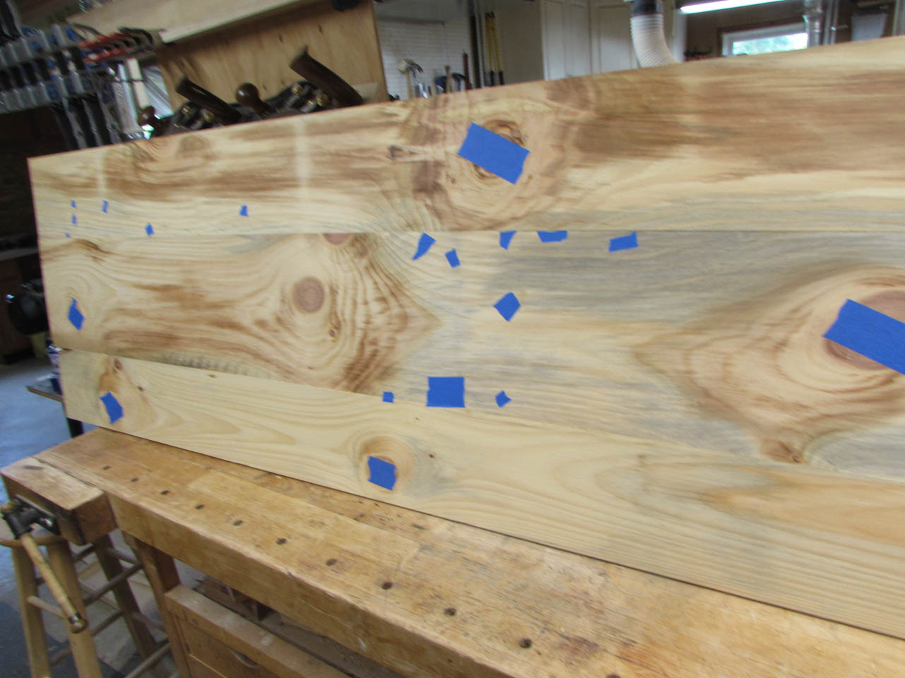 Instead of joining the board, then cutting the access doors back out, we are marking everything to keep the grain orientation correct, then cutting off the 11″ long piece that will be joined to either side and saving the middle section to make the access doors later.
