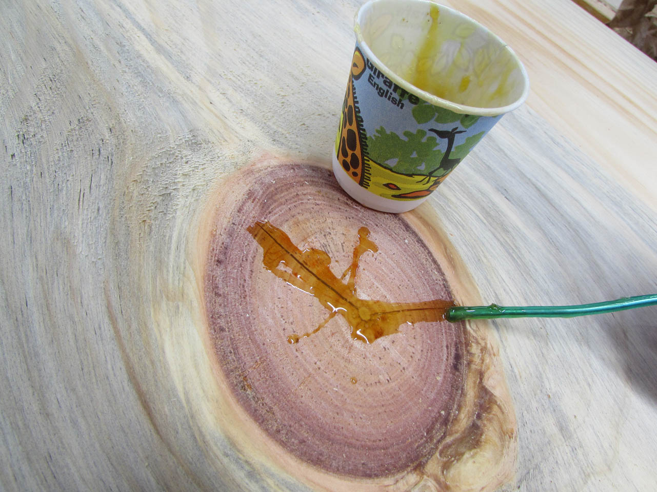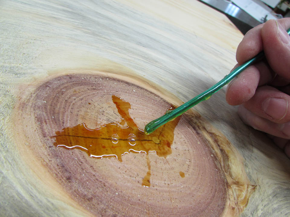 The epoxy I use is thin so that it will work it’s way down to the bottom of a crack. This means that I have to seal the holes and cracks on the bottom side of the desktop or it will just leak out.