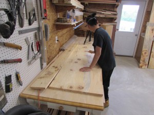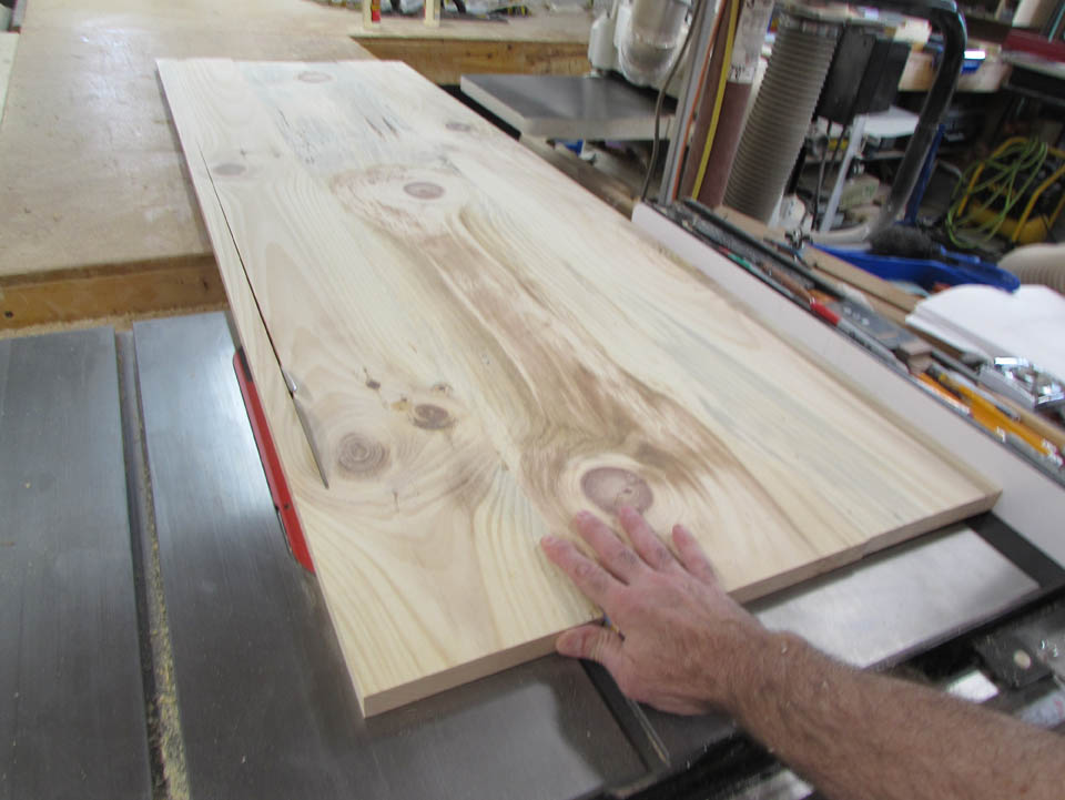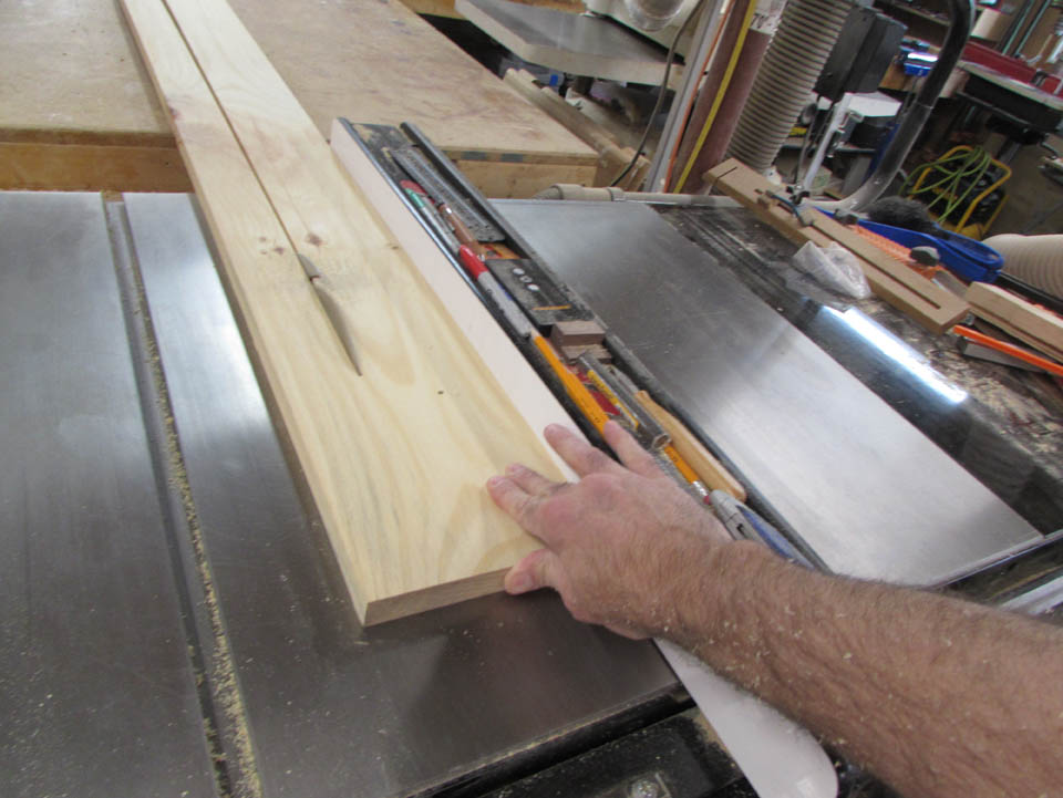 Next, he selected a board to match the desktop that will be used for the wire harness area. We cut them down to 4-1/4″ wide on the table saw.