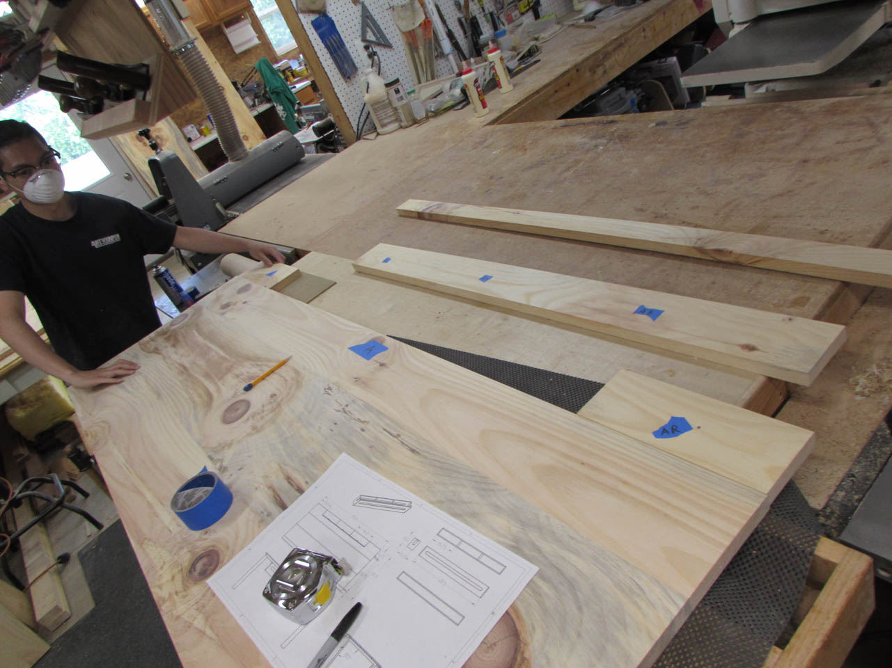 A friend from work was interested in building two custom desks for his apartment. He will be getting married soon and wanted a desk for him and his future wife. I recently acquired a large pile of air-dried pine that I don’t have the room to store, so I offered it to him for the build. Raphael wants to learn how to build it himself, so he will be coming over to the shop to help with the construction. Since he is an engineer, I assigned him the task of designing the desks in as much detail as possible. This is what he came up with:
