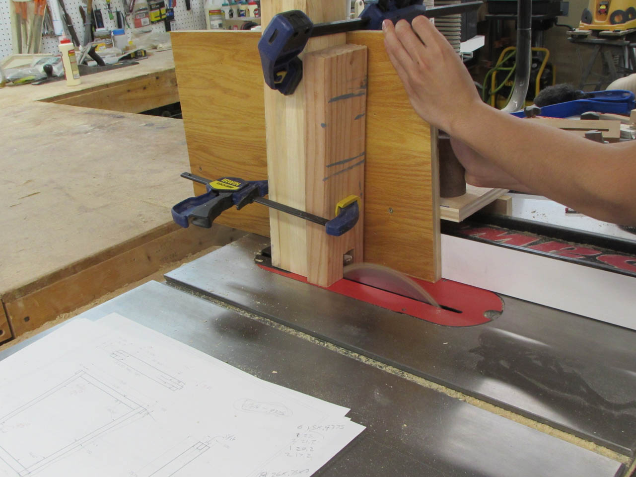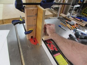 We clamped the legs to the jig, two at a time then ran them through the blade, moving the fence over 1/8″ at a time until the entire slot was cut.