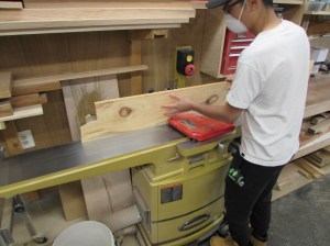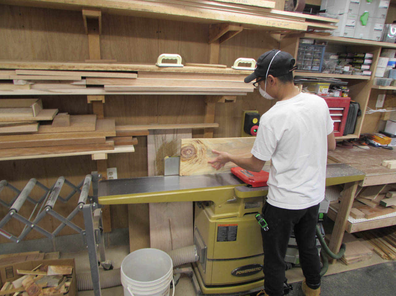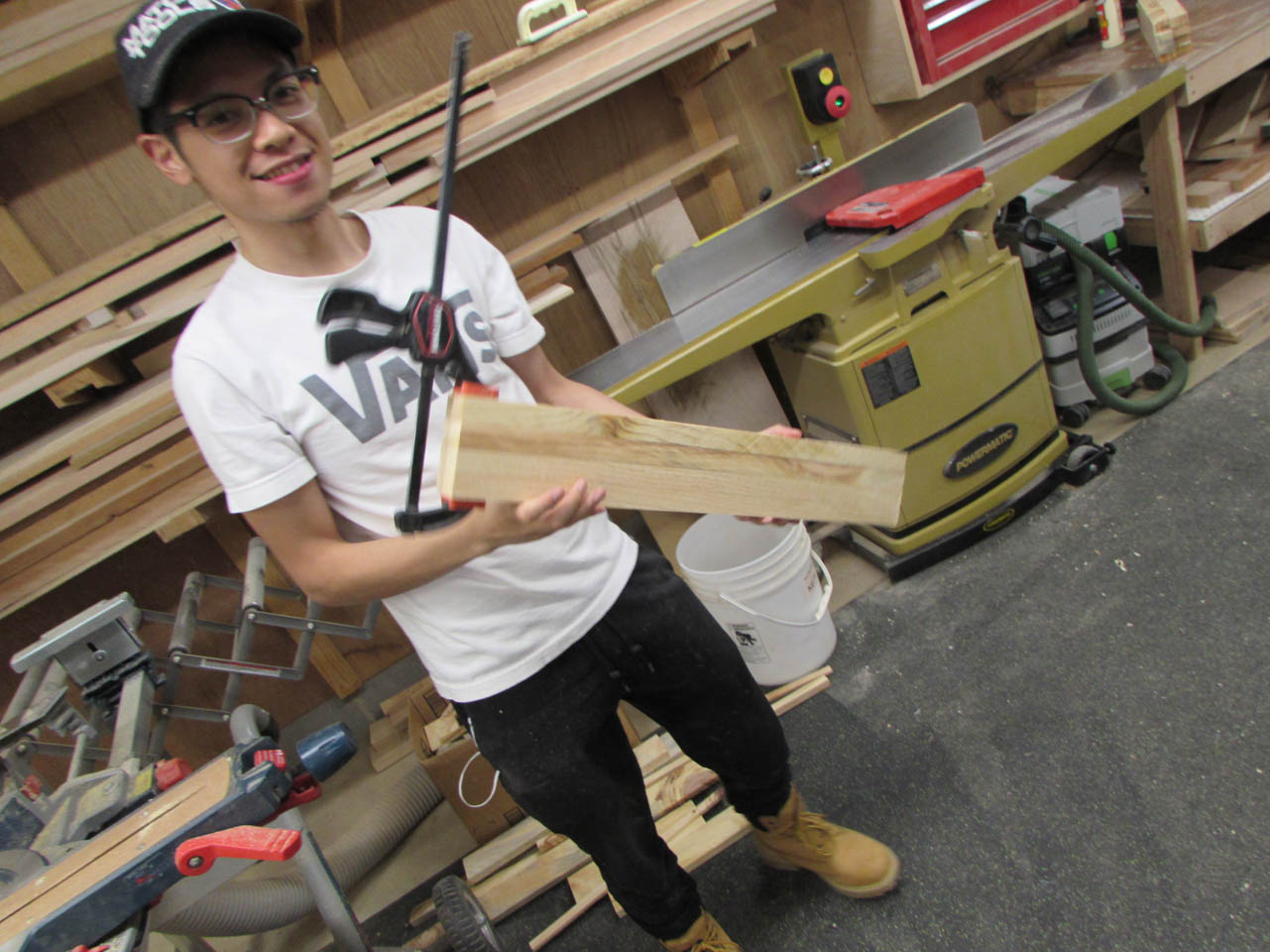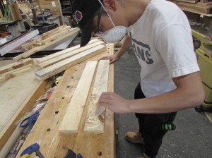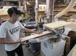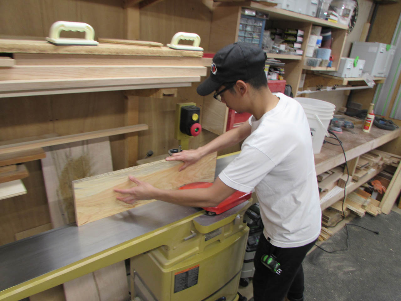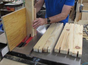 I started cutting some of the horizontal pieces to width while Raphael planed down some more boards to 3/4″ thick to create the vertical parts.