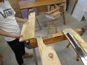 Starting with the left-over pieces that we already have planed down, Raphael joints one edge so we have a straight line to lay out from. Roughly tracing out the prototype parts gives us an idea what we need to cut out.