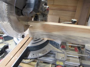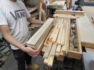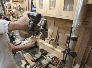 While that is drying, Raphael can cut the additional horizontal pieces to size. The top and bottom are made up of three pieces glued together so when the clamps are pulled from the frame, the additional laminations can be glued on.