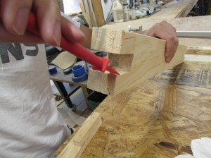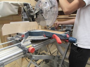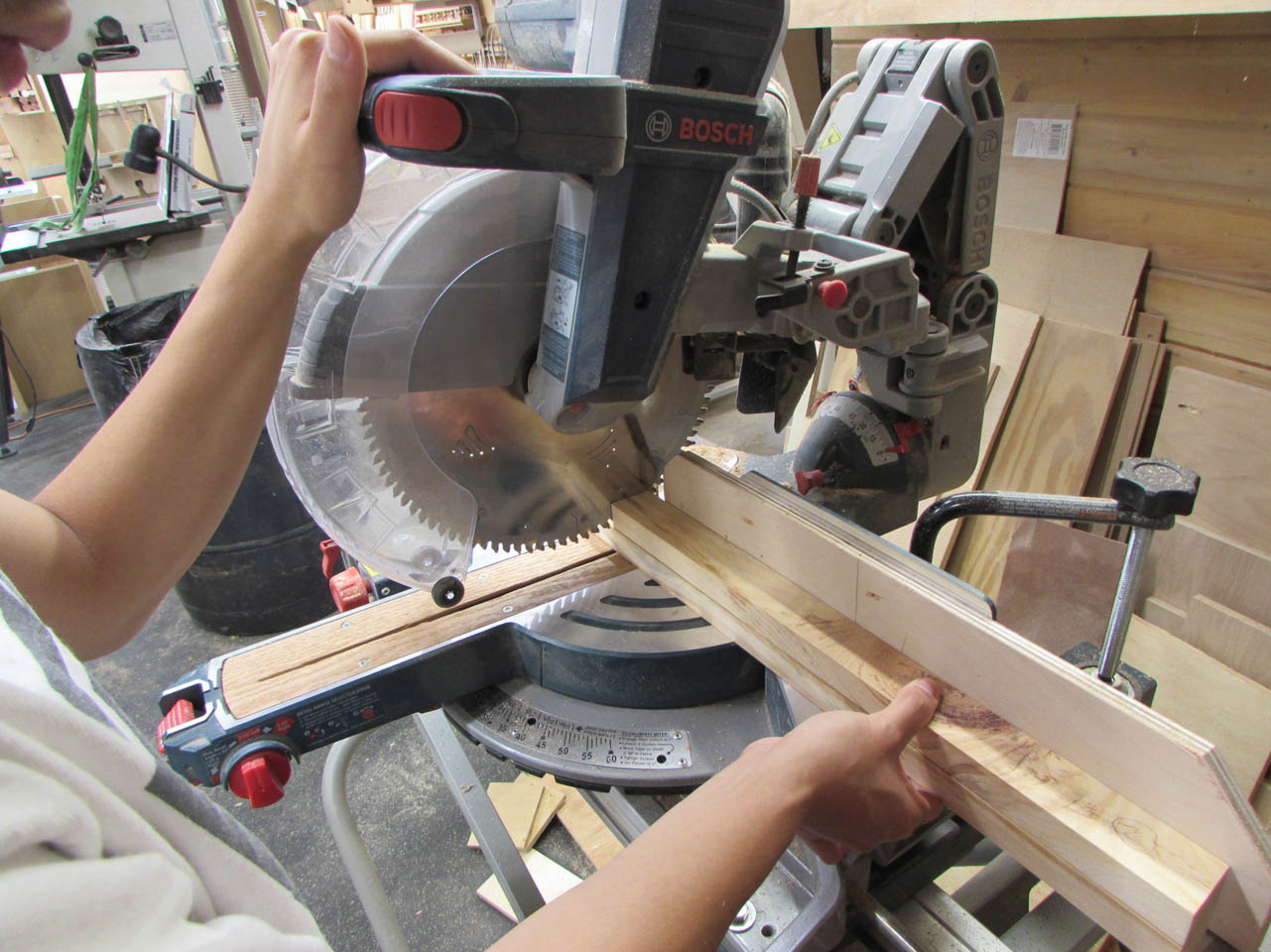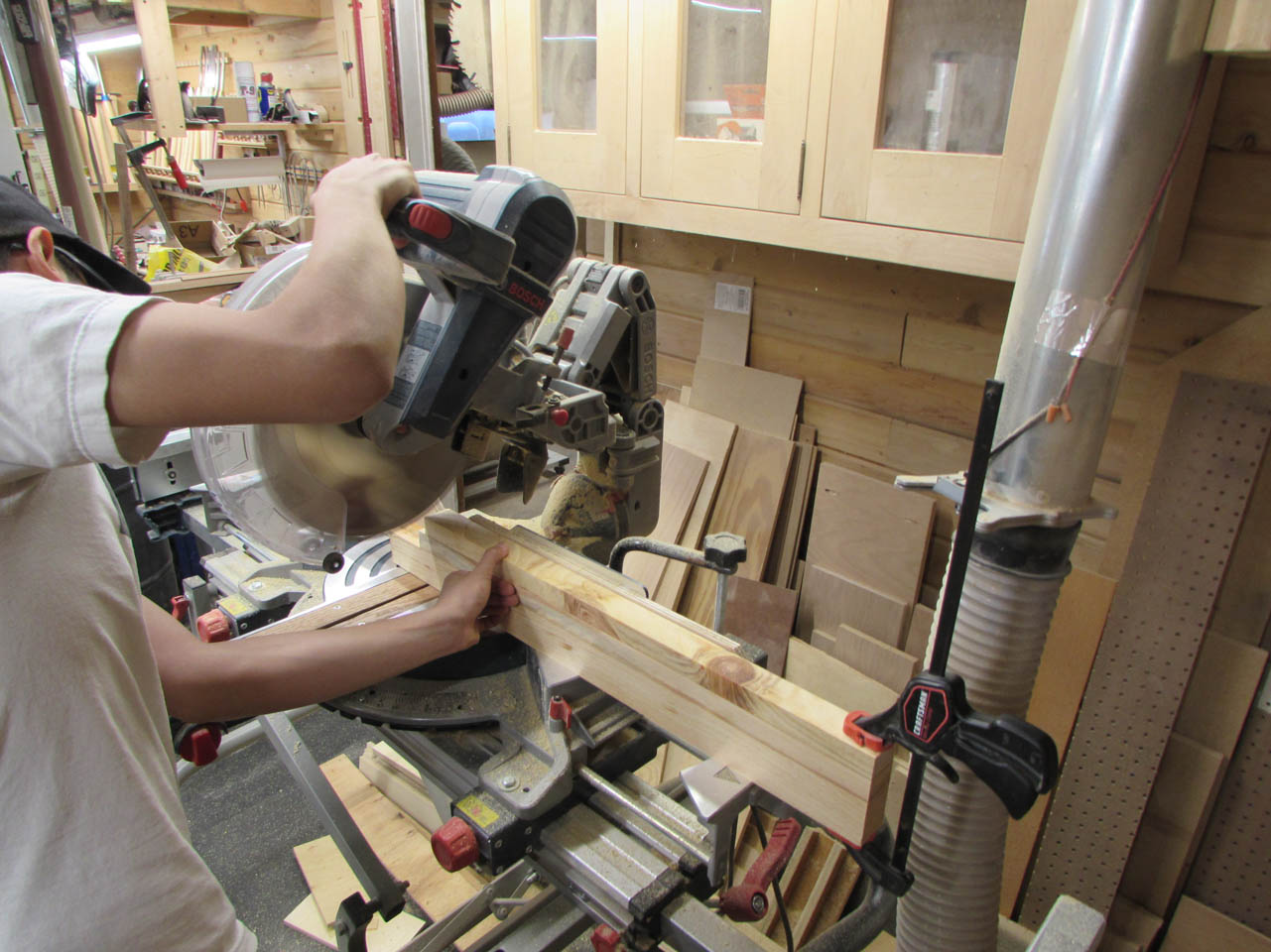 Now that we have the jig for assembly, we can also cut the bottom horizontal pieces. Matching to the prototype, Raphael cuts all four of them to length as well.