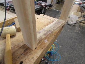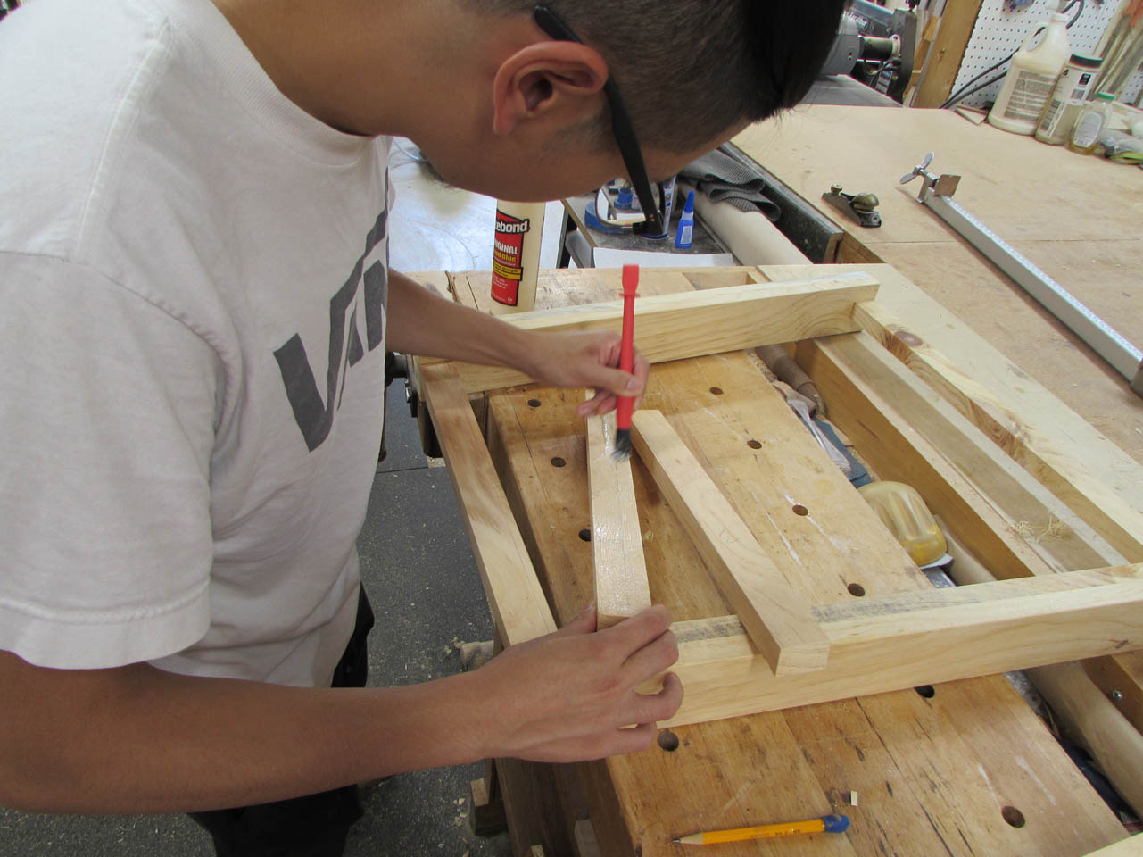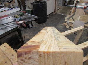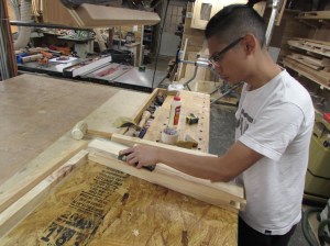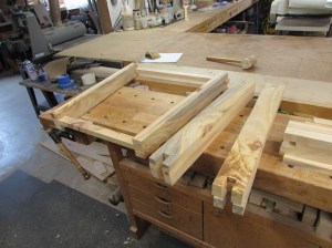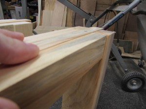 These horizontal, outer parts were originally cut long until the frames were glued up, then Raphael snuck up on the perfect fit by cutting them down about 1/32″ at a time until they fit just right.