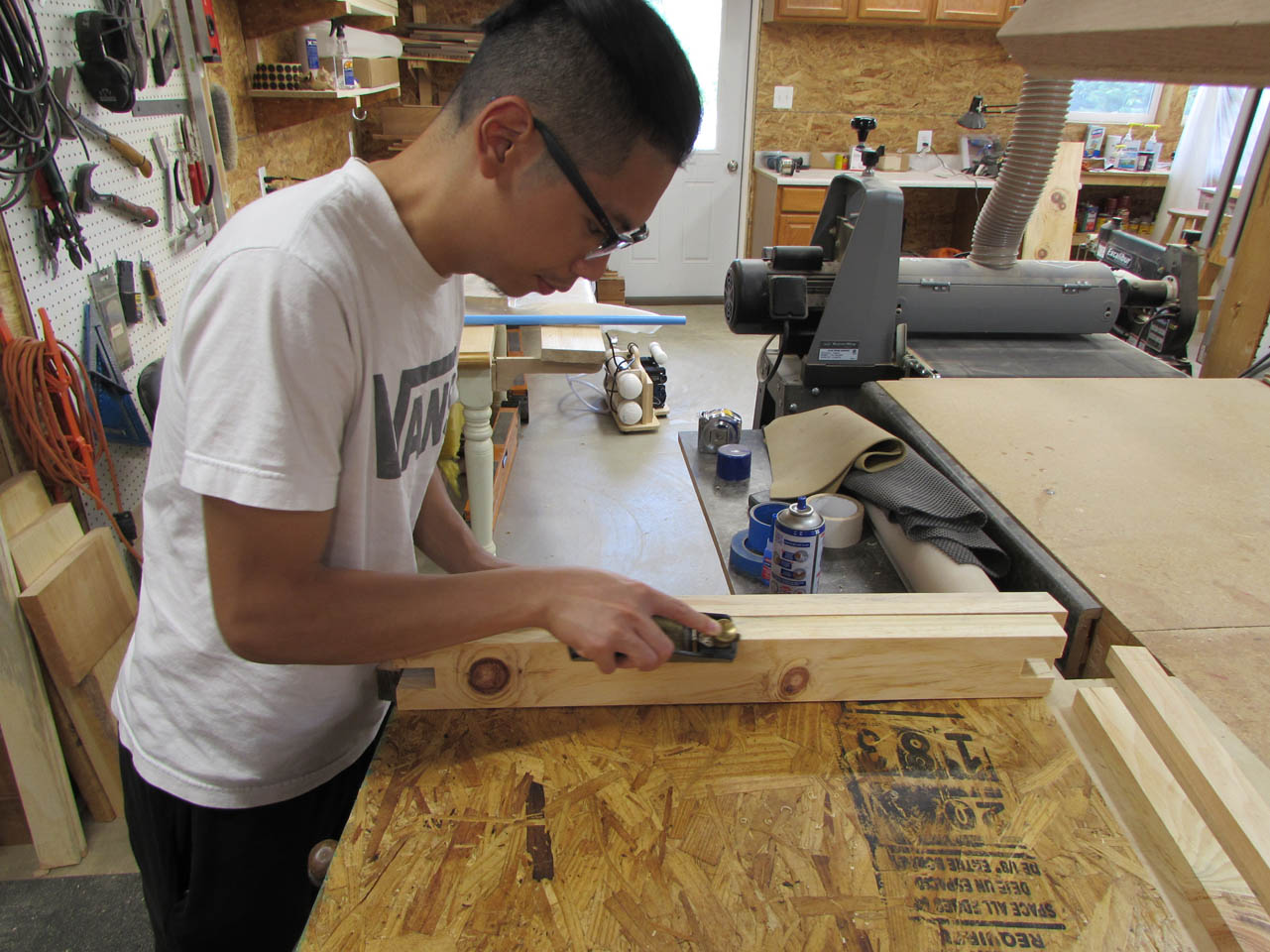 Before gluing up the legs, Raphael used the block plane to create a small bevel on the inside of the vertical sections. This is just to remove the sharp edges so you don’t cut yourself if you rub up against it. We will put a larger bevel on the outside later.