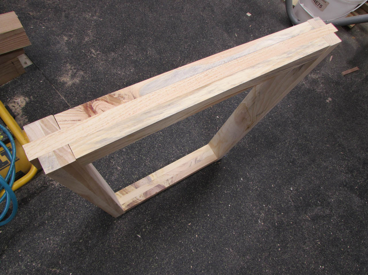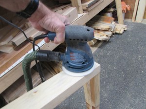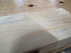 The inside area was a different story. Because of the vertical leg sections, the best way to flatten these surfaces was with the sander. Since this is air-dried pine, it gunks up the sander very easily. I used 40 grit paper for the areas that had to be taken down about 1/16″.