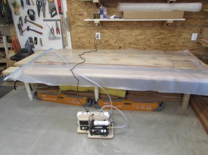 I went ahead and threw six more boards in the vacuum bag so we have stock to plane down for the wire/power strip basket in the back. Remember since the wood is air-dried, sometimes there can be bugs living in the wood. Putting them under vacuum for 24 hours seems to take care of that problem…