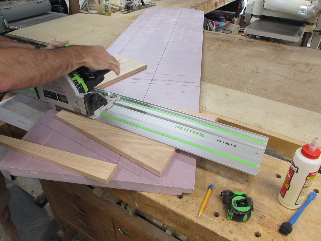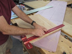 Since the panels are too big for my miter saw or my cross-cut sled, I use a tee-square and the track saw to mark and cut the edges.