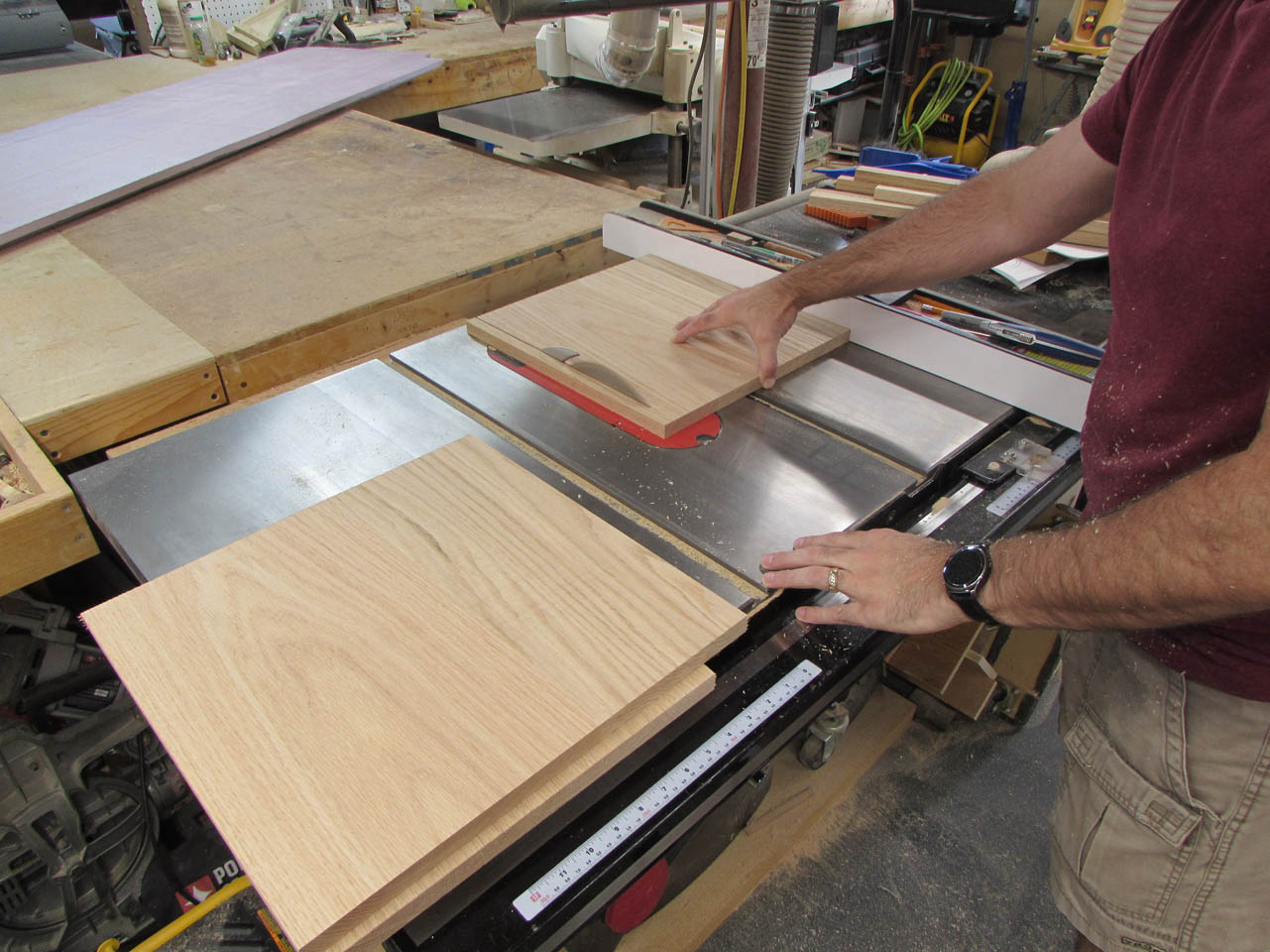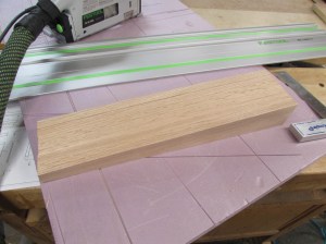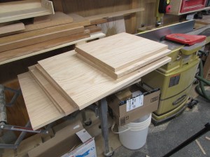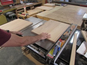 Before cutting down the larger panels, I decided to clean up my off-cuts and make the small pieces for the top and base. I cut all the 2-1/2″ wide pieces that will be used for the base skirt on the table saw. I will cut them to their exact length as I assemble the bases.