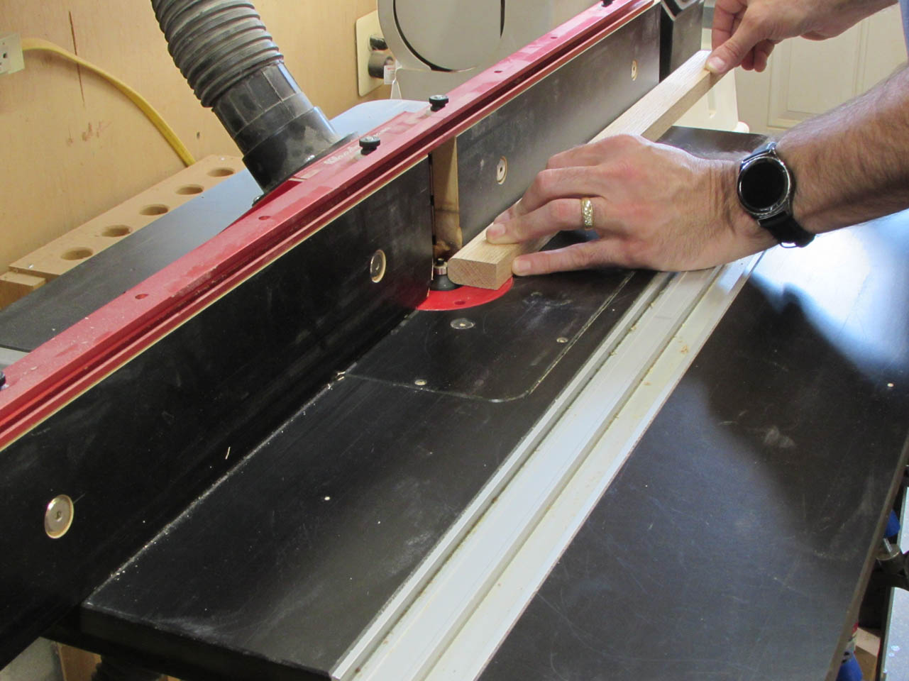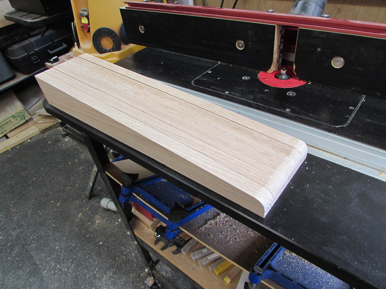 I grabbed a couple of 24″ long off-cuts and cut a 1/4″ radius onto each corner with my router table.