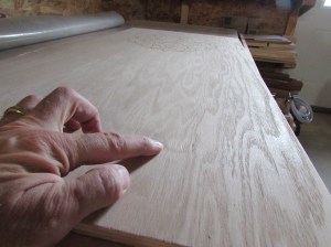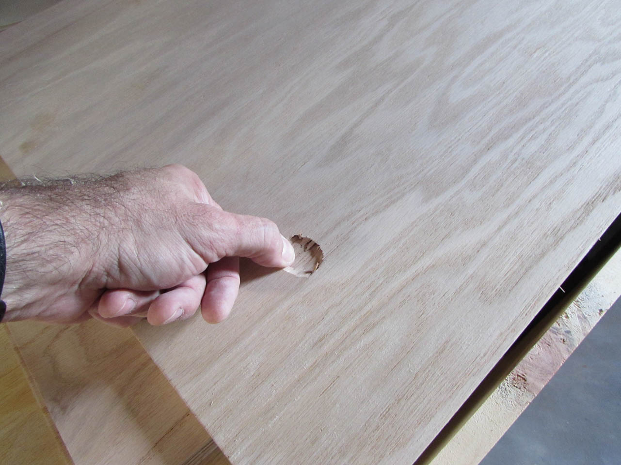 I flicked it and it sounded like paper. I knew that this indicated a void in the plywood, probably a knot hole in one of the veneer layers. I know I cannot use this board so I poked at the spot to find the extent on the hole.