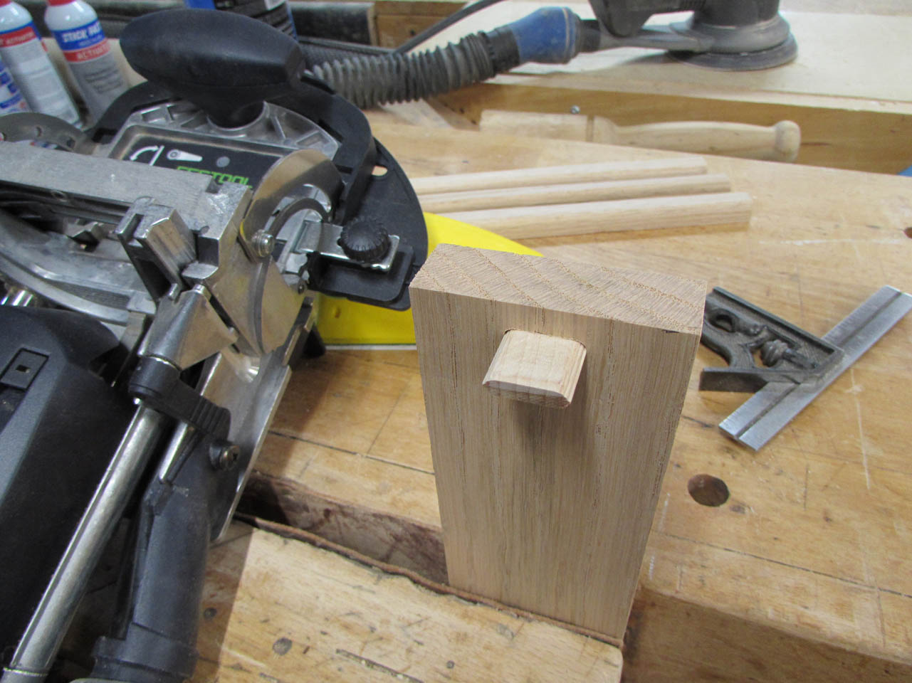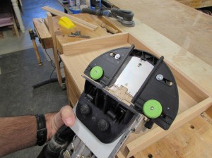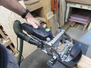 I am going to use my Domino jointer for this. I have a guide that I can set to the 2-1/2″ width and line up the cutter centered on the end of the short boards and the face of the longer boards to cut the mortise.