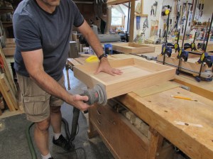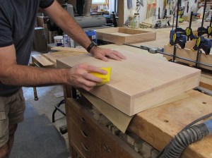 Before I start assembling the top and base, I need to sand all the glue joints flat and remove any dried glue. I also do the finish sanding of the larger faces. I can get all the edges after assembling the top and base.