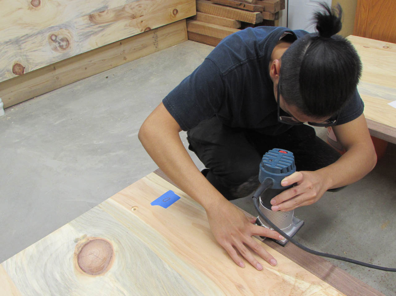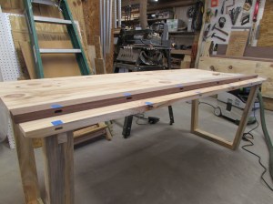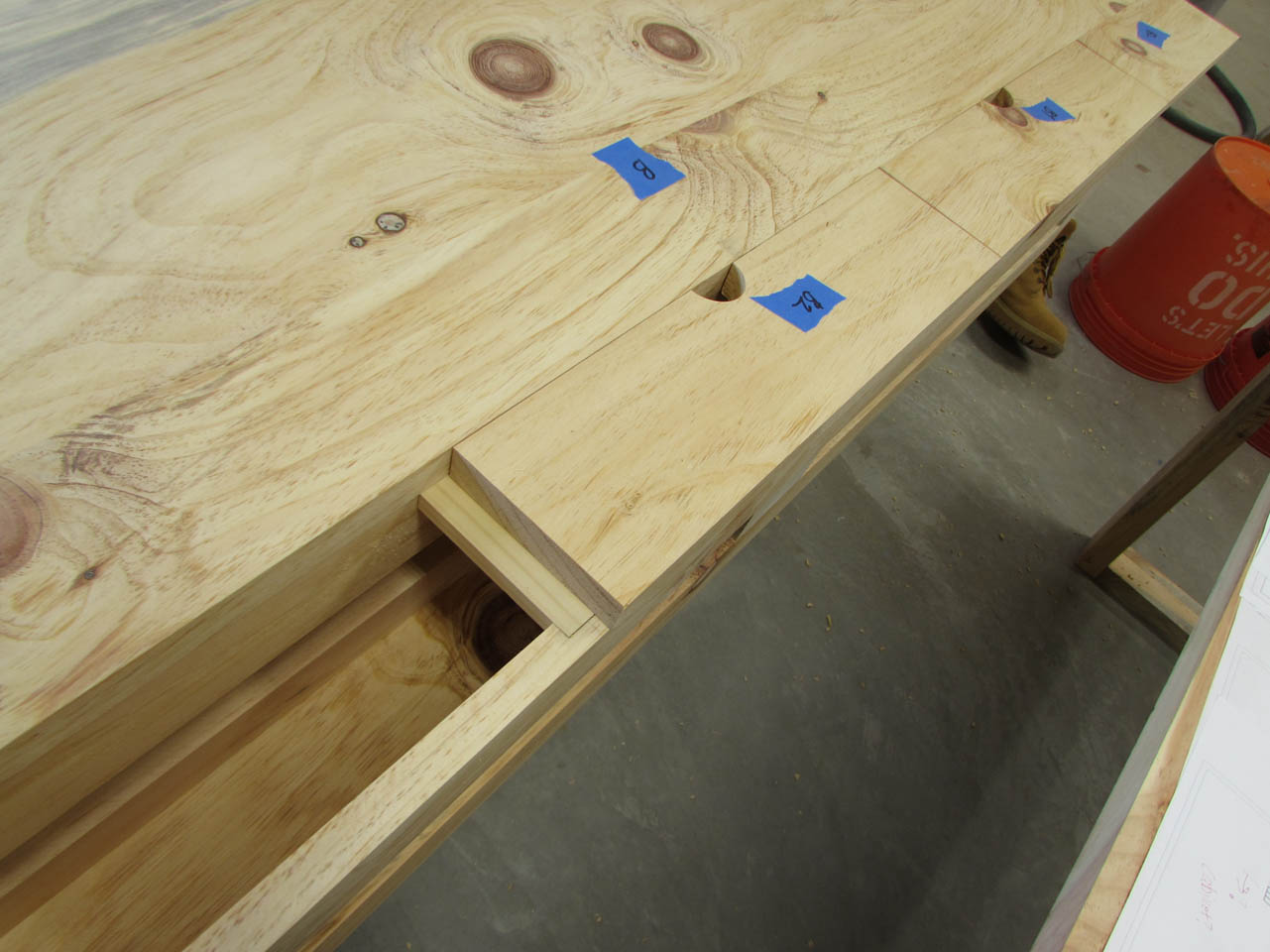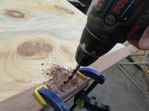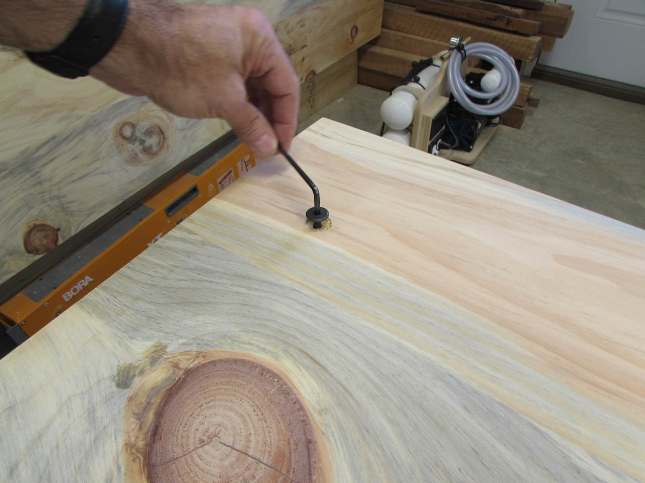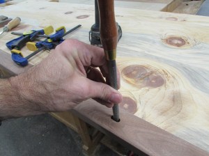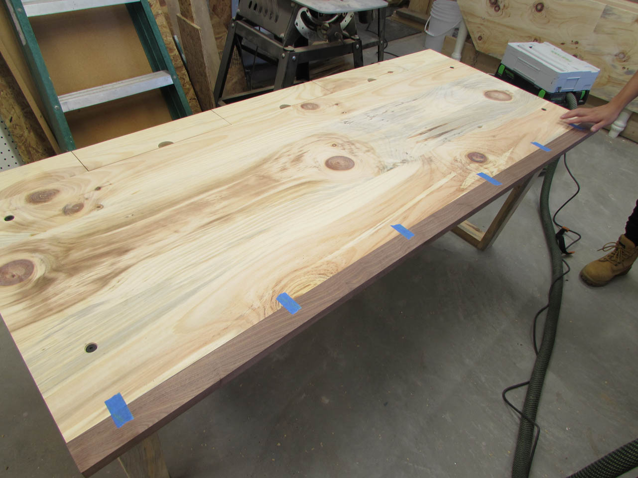 With most of the parts of these desks complete, we now have to start cleaning up the details of how it all gets assembled. He wants the legs to be removable for easy transport so we drilled two holes in the top of each and he installed threaded inserts. To locate the holes in the top and the legs, we set the top in place and drilled a small pilot hole through the top into the legs.