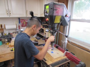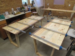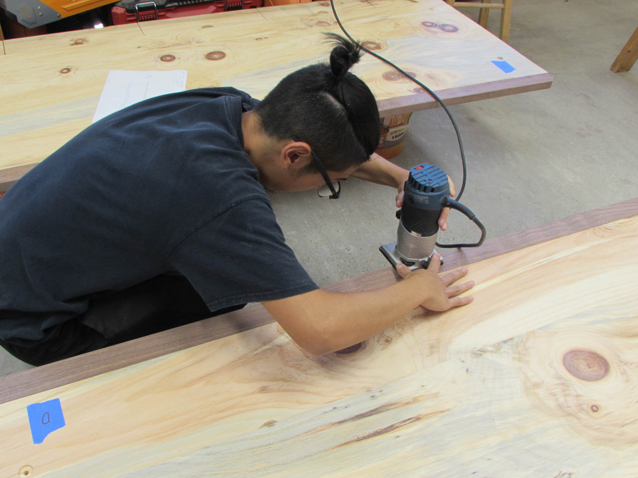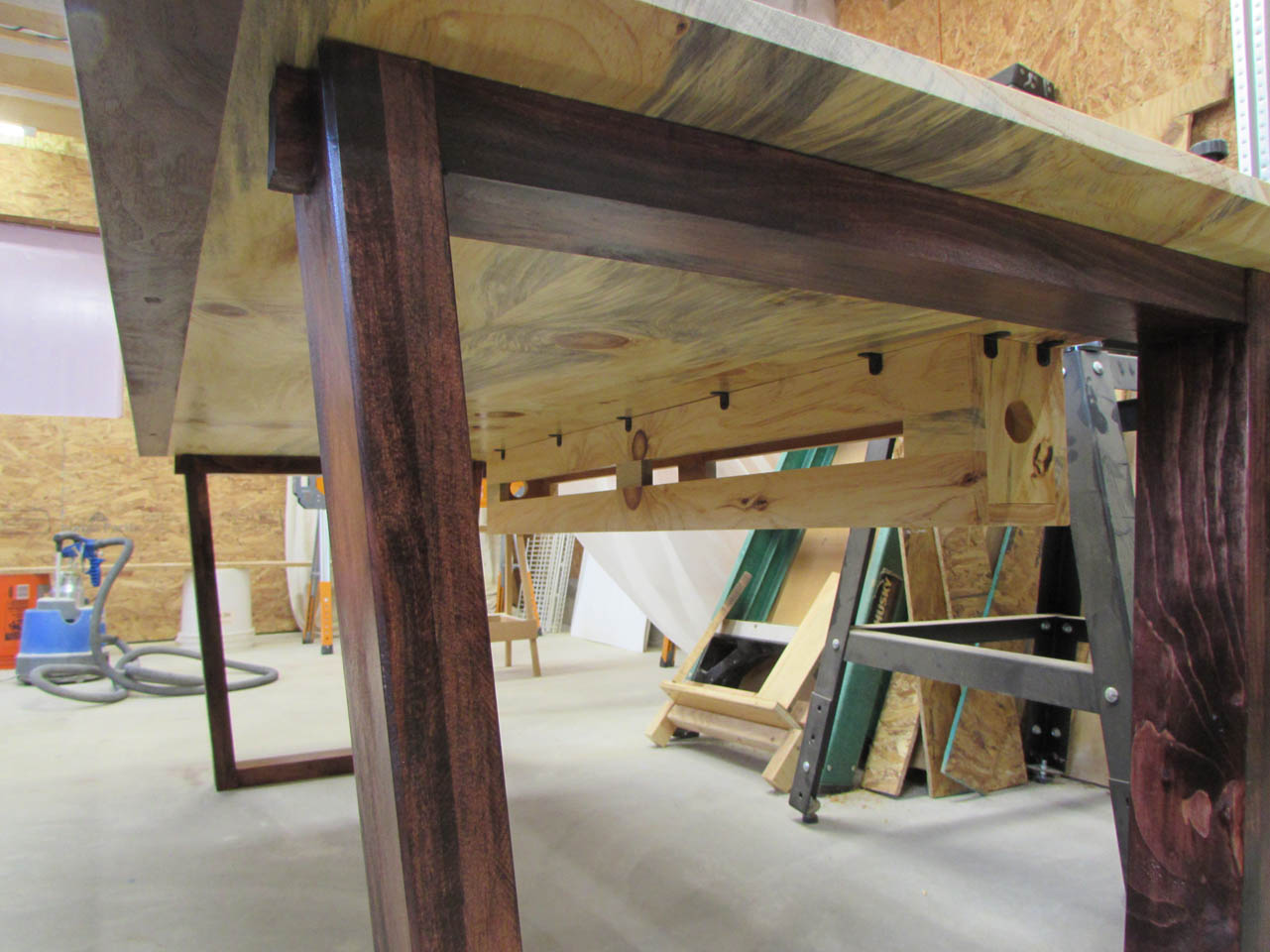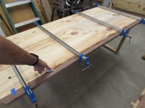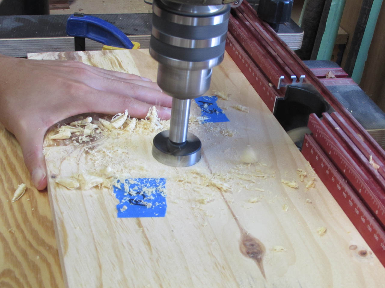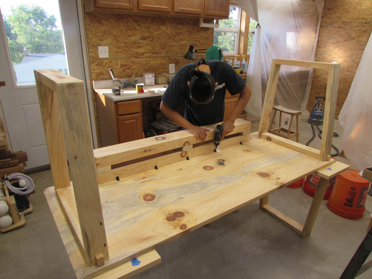 With most of the parts of these desks complete, we now have to start cleaning up the details of how it all gets assembled. He wants the legs to be removable for easy transport so we drilled two holes in the top of each and he installed threaded inserts. To locate the holes in the top and the legs, we set the top in place and drilled a small pilot hole through the top into the legs.