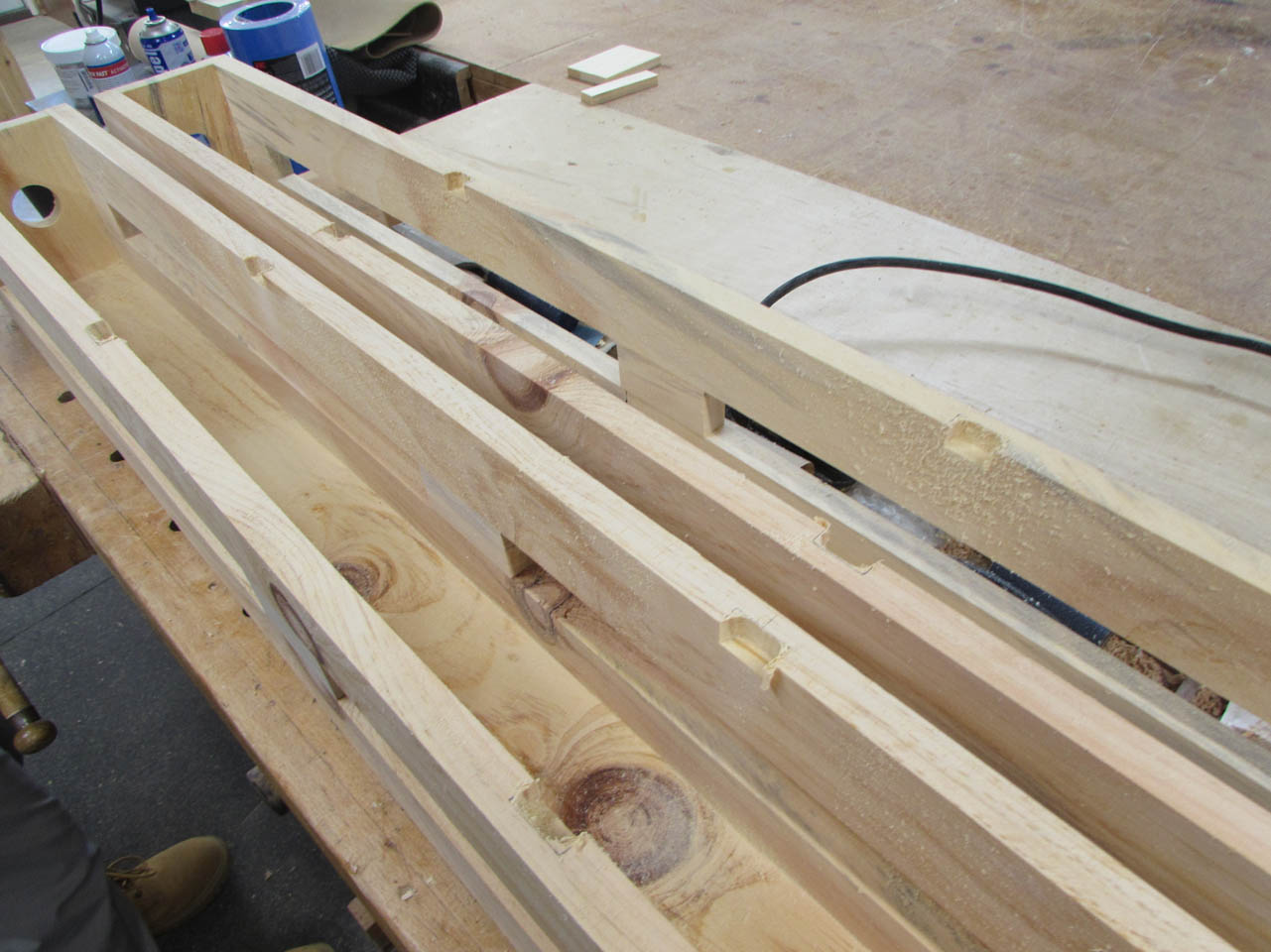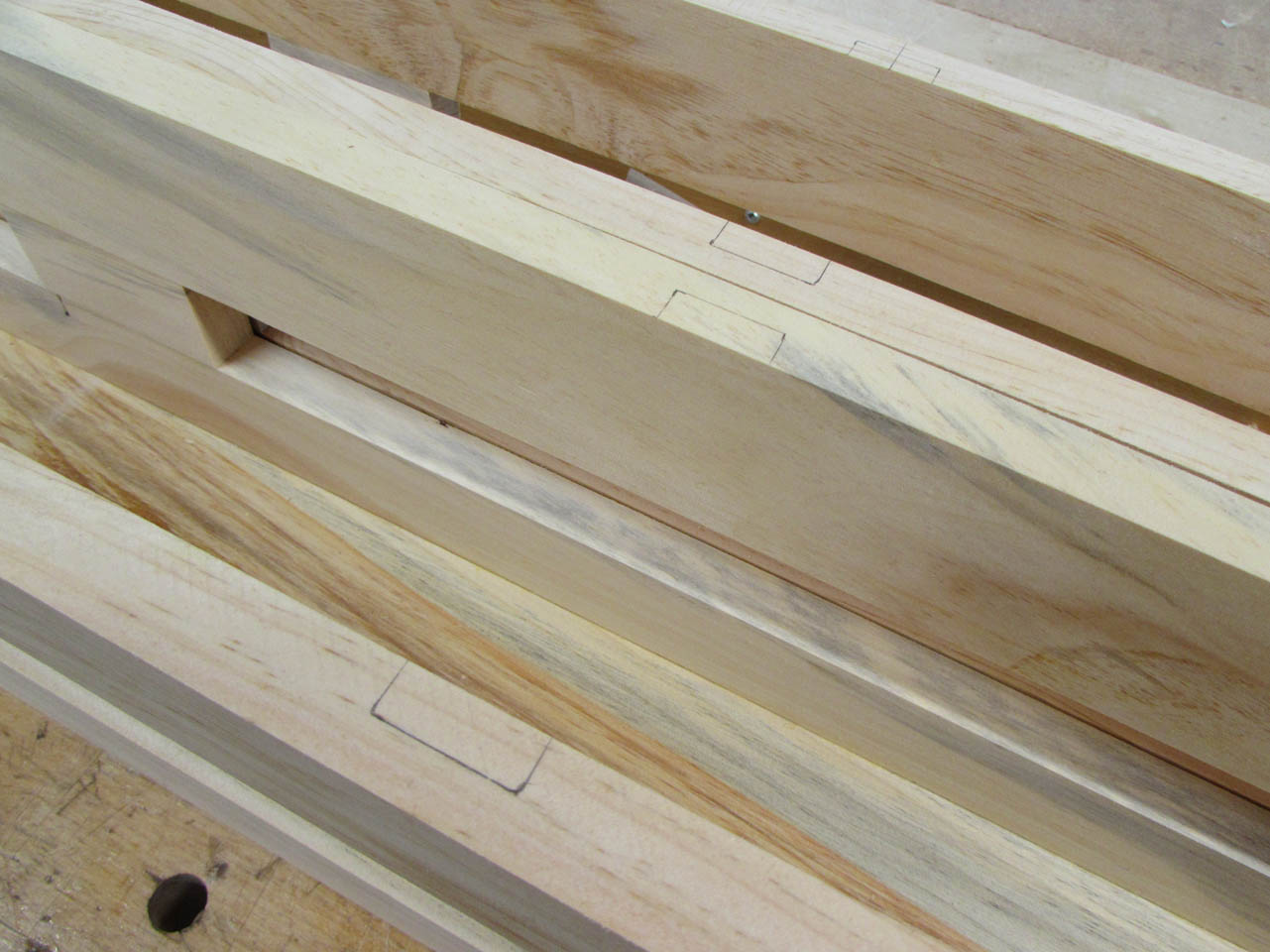 After cutting the tape to split them apart again, I used the Domino jointer to make a mortise at each mark. The ends were cut tight but the middle ones were made wider to make it easier to fit together with the tenons in place.
