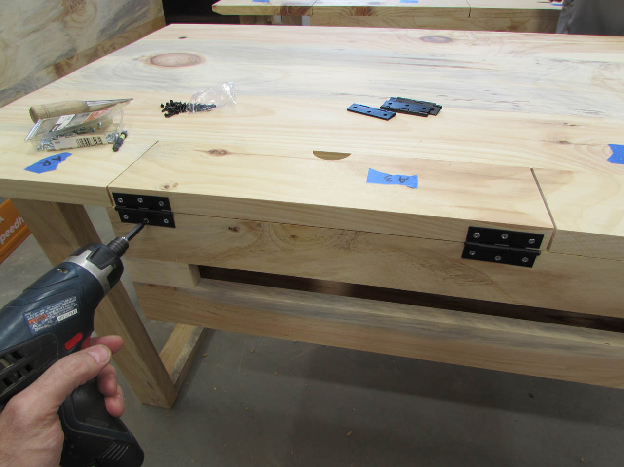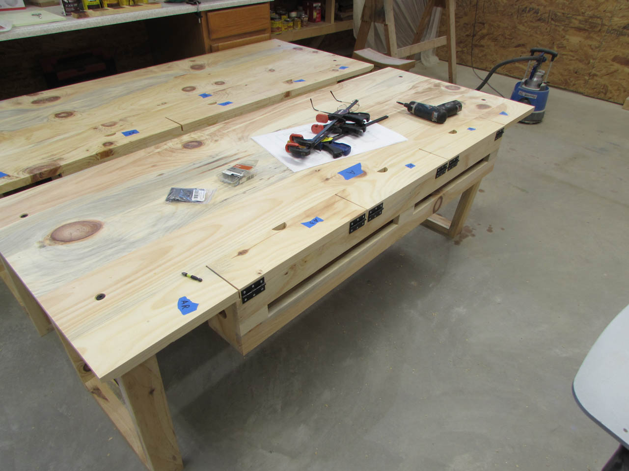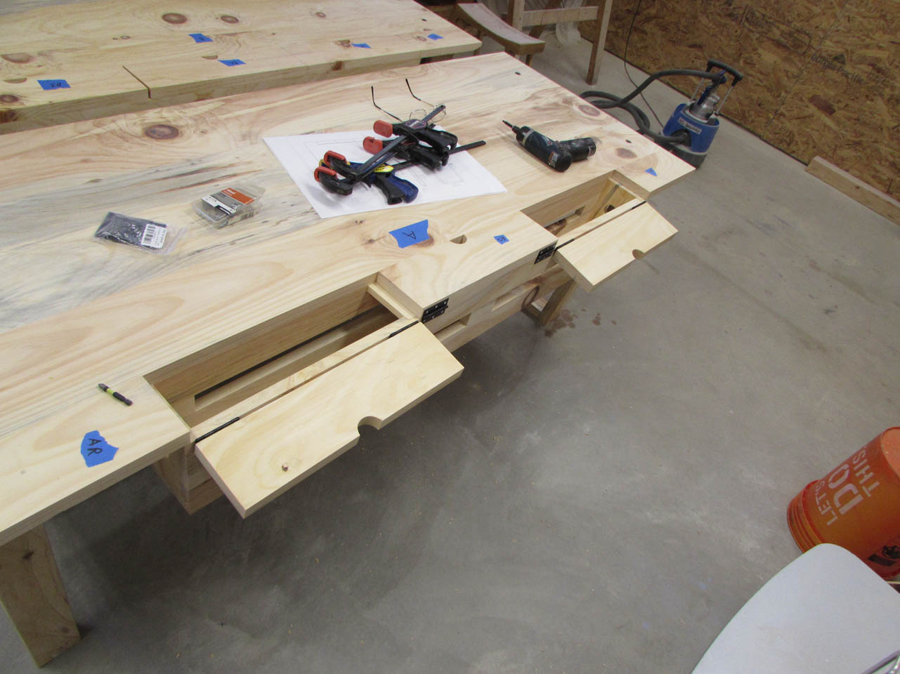 After drilling shallow counter-bores in the top of the desks, he inserted some large wafer head bolts to attach the top.