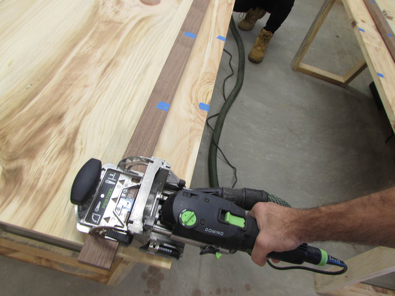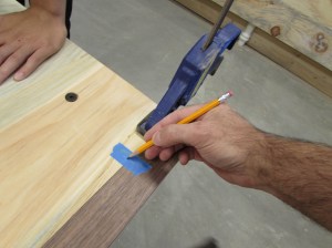 We will be using my Festool Domino jointer to cut mortises in the desk and the nosing. To locate those cuts, I laid painter’s tape along the joint and marked both sides. The tape makes it easier to see the marks and I don’t have to sand the marks off the wood when I am done.