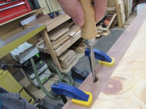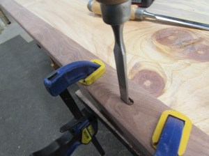 I marked and drilled two 3/8″ holes, then connected them with a chisel. I clamped a scrap block below to prevent any tear-out.