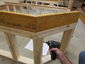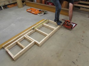 The final part of the floor does not have to be the heavy LVL’s because it will sit on a marble step. This is made from 2″x6″ material, cut down to 4-1/2″. Gaps are left in the areas where the microphone jacks need to be accessed. Holes will be drilled later to extend the jacks to the sides of the platform.