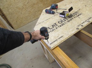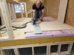 After calculating the location of the first piece of sub-floor, I measure and locate it.